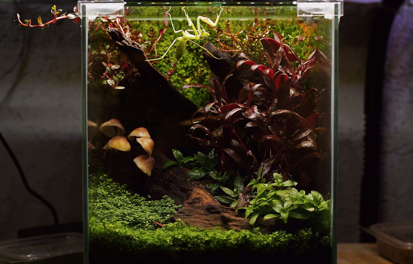 Um Stickluft zu vermeiden, sollte das Terrarium mit zwei Lüftungsflächen versehen sein. Ein Deckel aus Gaze dient dabei doppelt auch als Möglichkeit für die Insekten, sich festzuhalten und kopfüber zu hängen. Ein paar Pumpstösse aus einer Sprühflasche versorgen Boden, Pflanzen und Gottesanbeterin mit Feuchtigkeit. Die meisten Arten sind so einfach zufriedenzustellen.