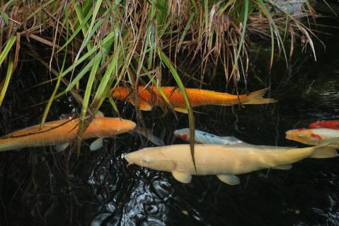 Kois werden seit 2000 Jahren zur Betrachtung von oben gezüchtet, damals die einzige Möglichkeit, einen Fisch zu bewundern. Somit ist der Einblick ideal, der sich von der Terrasse aus bietet. Flecken in Rot und Weiss, oder reissverschlussartige Zeichnungen auf dem Rückgrat kommen so zur Geltung. Andere Kois haben schwarz umrandete Augen, bräunlich goldene Oberseiten und rote Wangenregionen. Die Schätze Asiens haben viel Schwimmraum. Der Teich ist 15 Meter lang, fünf Meter breit und zwei Meter tief.