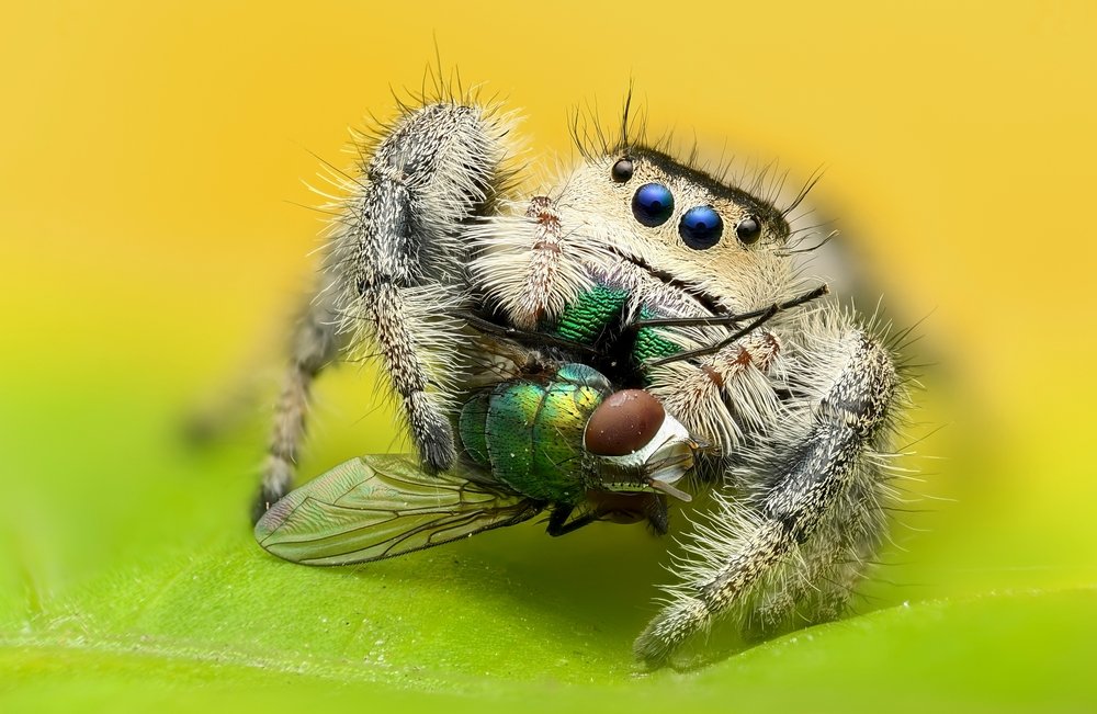 Menschen, die Angst vor Krabbeltieren haben und jede Spinne in der Wohnung eliminieren möchten, machen bei den Springspinnen oft eine Ausnahme. Grund dafür sind die riesigen Kulleraugen, die der Springspinne das Aussehen verleihen, als könnte sie keiner Fliege etwas zuleide tun. Das allerdings täuscht. Die geschickten Jäger überwältigen Beutetiere, die bis zu eineinhalbmal so gross wie sie selbst sind.