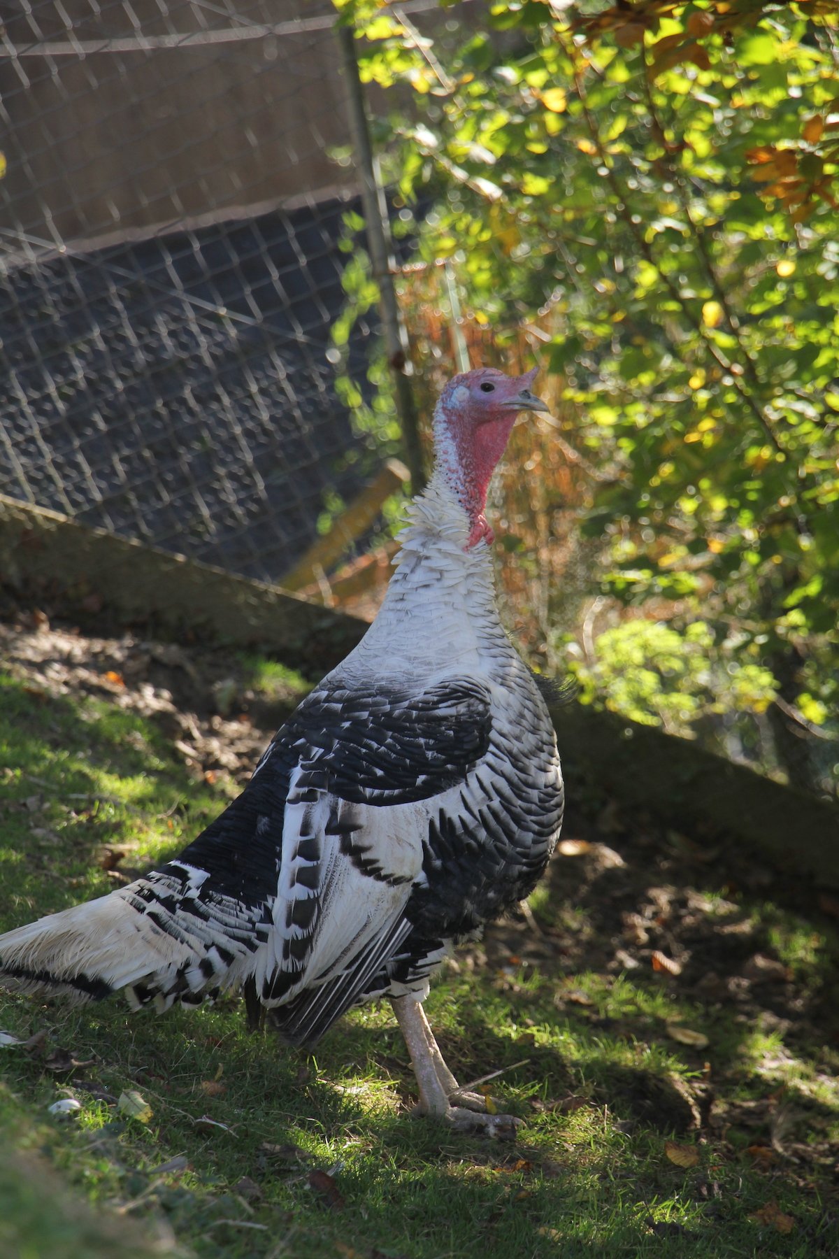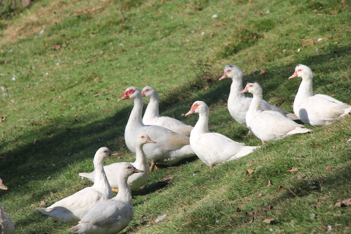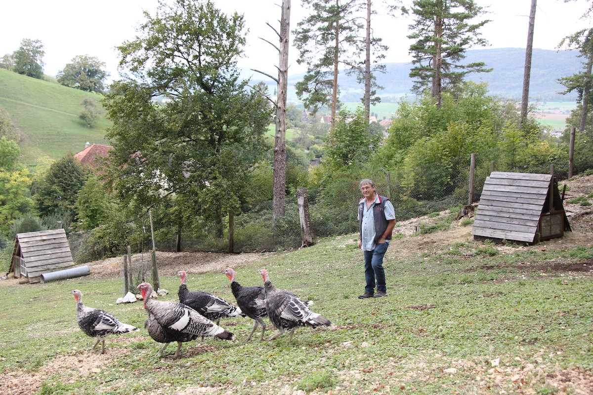 Im Park von Mervelier leben auch viele weisse Moschusenten. Die Stammform dieses stattlichen Höhlenbrüters stammt aus Südamerika. Richard Marquis sagt: «Wenn die Küken schlüpfen, nehme ich sie mit der Ente für die ersten Wochen in ein geschütztes Gehege. In diesem Sommer führte eine Ente 27 Küken.» Wie Soldaten während der Parade stolzieren Indische Laufenten in Einerkolonne vom unteren Teil des Parks auf das Plateau, angeführt von einer Pommerngans. Mit wachsamem Blick aus markanten Augen schaut eine etwas abseitsstehende Gruppe von Gänsen zu Richard Marquis. Er betrachtet mit nachdenklichem Blick sein Geflügel und sagt: «Die Diskussion der Gänse, wie interessant das doch ist. Ich frage mich immer: reden sie über mich? Ah, das wäre aufschlussreich, die Sprache der Tiere zu verstehen.» Was genau sagen seine Cröllwitzer Puten mit ihrem eigentümlichen Blubbern? Auch sie sind Teil des Parks.