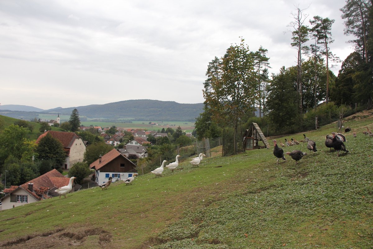 Seine Tiere tummeln sich in einem riesigen Park mit Blick auf das Hügelland um Delémont. «Mich interessiert dieses Haltungssystem ganz besonders», sagt der charismatische Romand. Der Mann mit Brille, gräulichem Haar und Schalk in den Augen zeigt über sein grosses Landstück für Emu, Ente und Co. Wo es endet, ist nicht so genau ersichtlich. «Der Wald dahinter und das Brombeerdickicht gehören auch dazu», fügt der Tierliebhaber an. Das gesamte Terrain sei ungefähr7000 Quadratmeter gross.