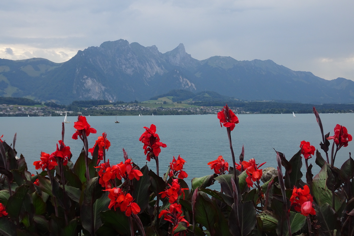 Nach dem Pflanzentunnel öffnet sich der Blick auf flammend rot blühende Canna. Auf dem See schneiden Segelschiffe durch das Wasser, in der Ferne ragt die Stockhornkette in den von Wolken durchzogenen Himmel. Der Garten ist in eine imposante Umgebung eingebettet.