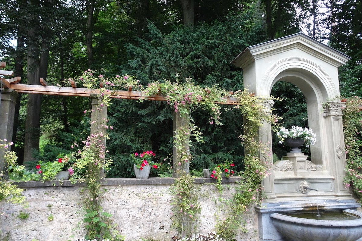 Nahe beim Schloss gibt ein weiteres schmiedeeisernes Tor den Blick frei auf einem ornamentalen Blumengarten, der zum Schloss gehört. Um das Gebäude zieht sich ein Graben, das Koniferentälchen. Überhaupt gedeihen im Schlosspark viele Nadelhölzer. Die Libanonzedern und Mammutbäume sind am charakteristischen. Sie kontrastieren mit den Grüntönen der mächtigen Laubbäume wie dem japanischen Kuchenbaum, dem Ginkgo oder dem Tulpenbaum.