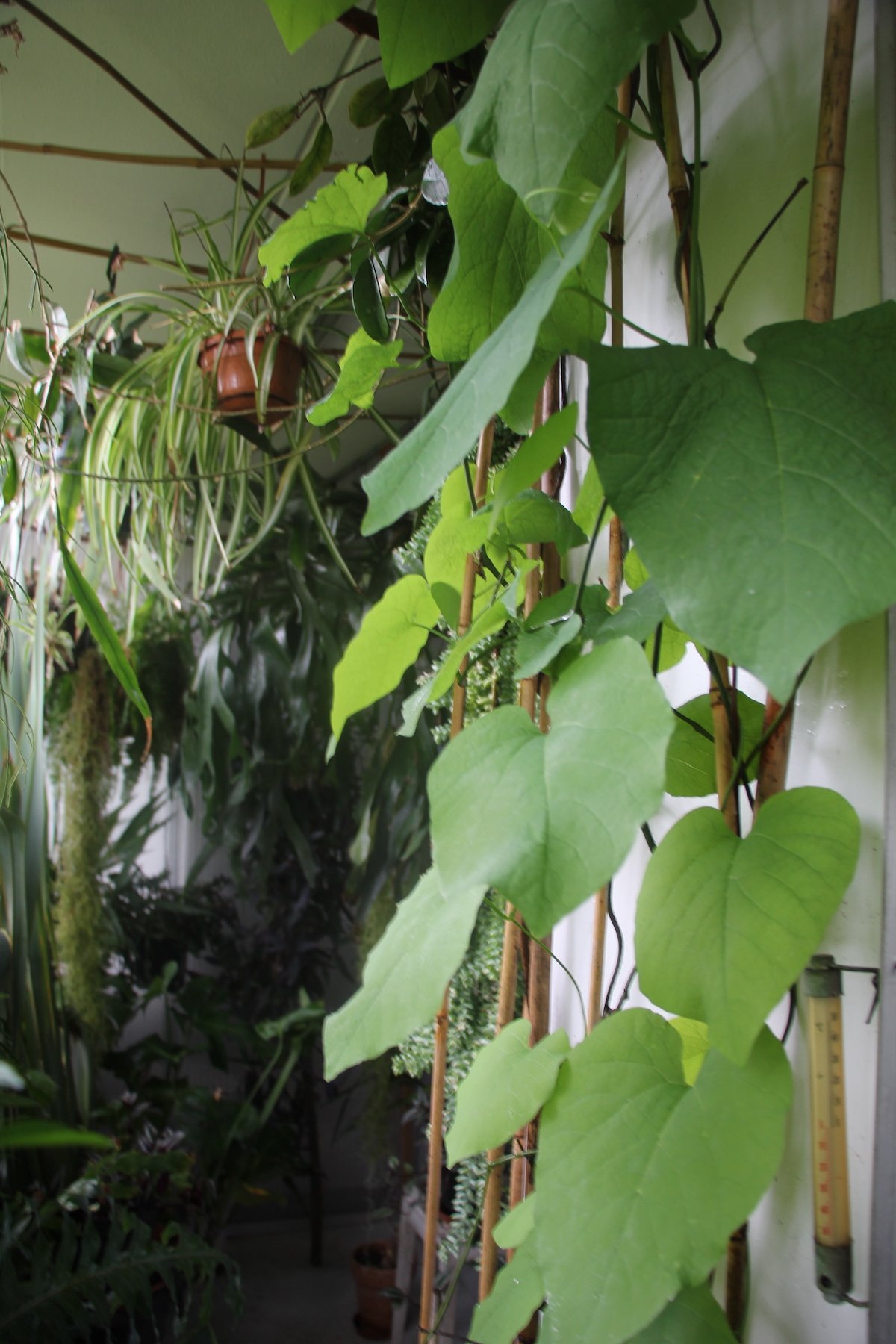 Das Osterluzeigewächs stammt aus den USA und verleiht einer Mauer durch die grossen, hellgrünen Rundblätter etwas Tropisches. Die Pfeifenwinde braucht eine Kletterhilfe, windet sich aber auch entlang von waagrecht gespannten Drähten auf dem Balkon.
