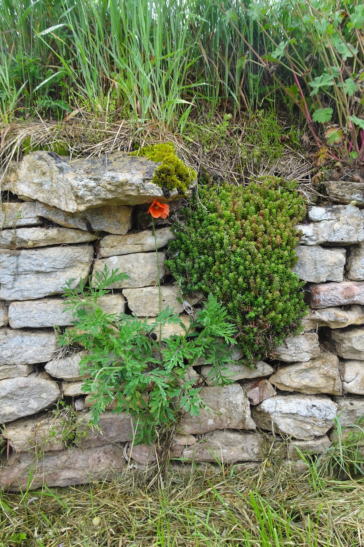 Trockenmauern werden je nach Region und Position von unterschiedlichen Pflanzen bewachsen. Steinbrech-, Farnarten und Storchenschnabel siedeln darin. Auch Wollblumen spriessen, nebst dem Zimbelkraut. Für sukkulente Arten, also solche, die Wasser speichern, wie Hauswurz und Sedum oder Mauerpfeffer, sind Mauern prädestiniert. Auch Algen und Moosarten besiedeln Trockenmauern mit den Jahren.