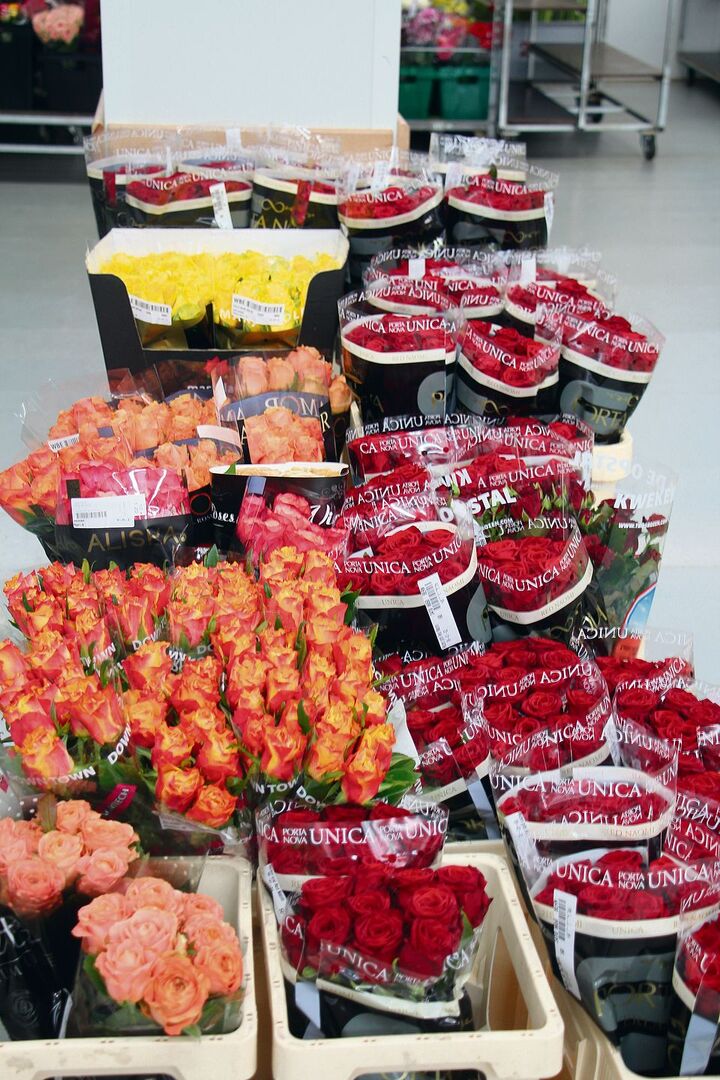 Die Rosenproduktion in der Schweiz reicht bei Weitem nicht aus, um die Nachfrage zu decken. Darum kauft die Blumenbörse das ganze Jahr über Rosen bei niederländischen Grosshändlern ein. «Sie werden im Flugzeug platzsparend ohne Wasser transportiert», erklärt Pascal Speck. Eine im Winter gekaufte und in Äquatornähe geschnittene Rose ist etwa vier Tage unterwegs, bis sie beim Endkunden ist. Eine Schweizer Rose im Frühsommer wird am Morgen auf dem Feld geschnitten und bei der Blumenbörse angeliefert. Am Vormittag steht sie bereits im Fachgeschäft zum Endverkauf. Auch Protea-Blüten, jetzt in der Winterzeit populär, stammen aus Zuchtbetrieben in Südafrika. Während unseres Winters herrscht dort Sommer, die Proteas werden draussen angebaut.