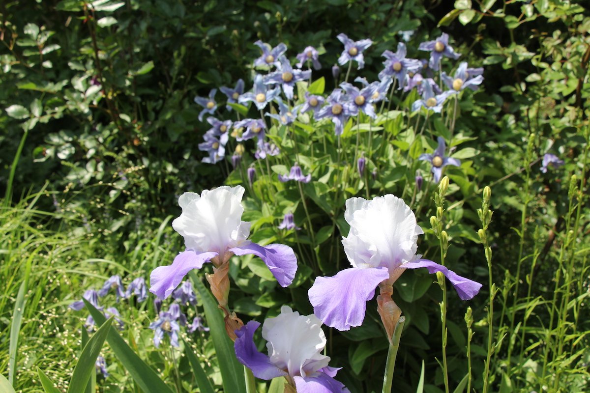 Dahinter Iris in Lila- und Weisstönen, als würden sie Ballett tanzen und nicht bemerken, dass sie gleich überspült werden von der Kolkwitzie, einem Strauch, dessen blütenbesetzten Äste sich wie eine schäumende Meereswelle neigen.