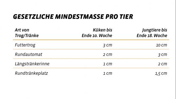 Letzterer ist dagegen bei einem Futtertrog fast nicht zu vermeiden. In diesem Wachstumsstadium der Küken empfiehlt sich daher eine Kontrolle der Fütterungsgefässe mit den gesetzlichen Vorschriften. Und in dieser Zeit ist es ebenfalls empfehlenswert, der Jungmannschaft ein zusätzliches Gefäss zur Verfügung zu stellen. Bei den Futtergefässen ist es wie mit dem Stall: Sie müssen stets dem Alter und der Gruppengrösse angepasst werden.