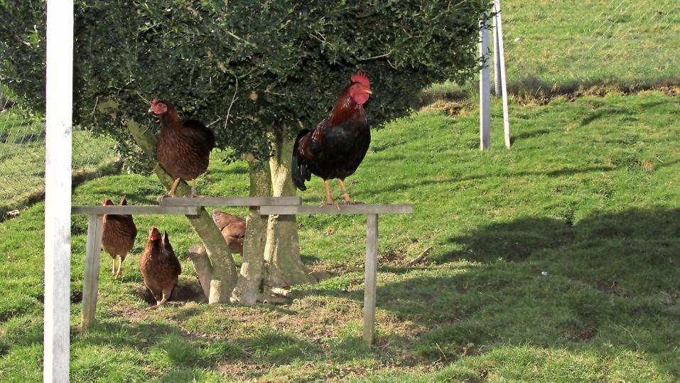 Eine gute Struktur schützt aber nicht nur vor Fressfeinden. Die rangniedrigen Tiere können sich dort auch vor den ranghöheren in Sicherheit bringen. Denn Hühner sind untereinander oft recht unfreundlich und zickig. Bei Rangkämpfen sorgt jedoch der Hahn für Ordnung – sofern einer gehalten werden kann.