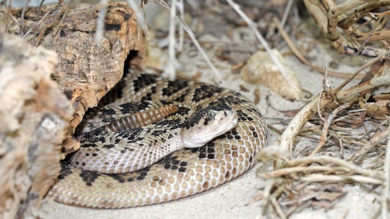 Unten öffnet er eine Türe. Warme Luft strömt uns entgegen, Kunstlicht scheint hell in den Raum. Es stammt von diversen Terrarien, die in Reihen an der Wand angebracht sind. Plötzlich ein Rasseln! «Aha, sie warnt», sagt Schneider. Er zeigt auf ein Terrarium in Bodennähe mit zwei sandfarbenen Schlangen. Ein rotes Schild an der Scheibe weist sie als Texasklapperschlangen aus. Während ein Tier unbeweglich daliegt, hat das andere die Betrachter im Blick. «Diese Art stammt aus dem Südwesten der USA und aus Mexiko», erklärt Schneider. Klapperschlangen sind meistens Wüstenbewohner. Schneider hat sich auf Arten aus dem Grenzgebiet der USA und Mexiko spezialisiert.