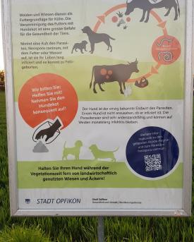 Welche, das wird bei einem Spaziergang entlang der Weiden und Felder deutlich. Die grossen Tafeln, welche die Stadt Opfikon an deren Rändern aufstellen liess, sprechen eine klare Sprache: «Liebe Hundehalterin, lieber Hundehalter, Weiden und Wiesen dienen als Futtergrundlage für Kühe. Die Verunreinigung des Futters mit Hundekot ist eine grosse Gefahr für die Gesundheit der Tiere», ist darauf zu lesen. Nachdem die Plakate vor zwei Monaten aufgestellt wurden, nahm der «Stadtanzeiger» das Thema auf und titelte am 25. März: «Opfiker Plateau als Hundeklo».
