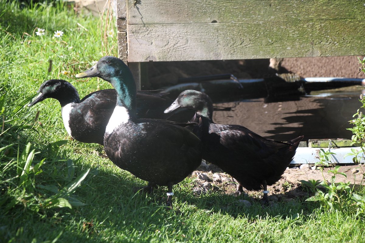 Die Pommernenten sind zurück von ihrem Marsch, der Kater Murrli räkelt sich auf der Laube vor einem Kistchen mit Erdbeeren. Auf der Weide äsen die Kühe. Idylle am Mittag auf dem Arche-Hof Schangnau.