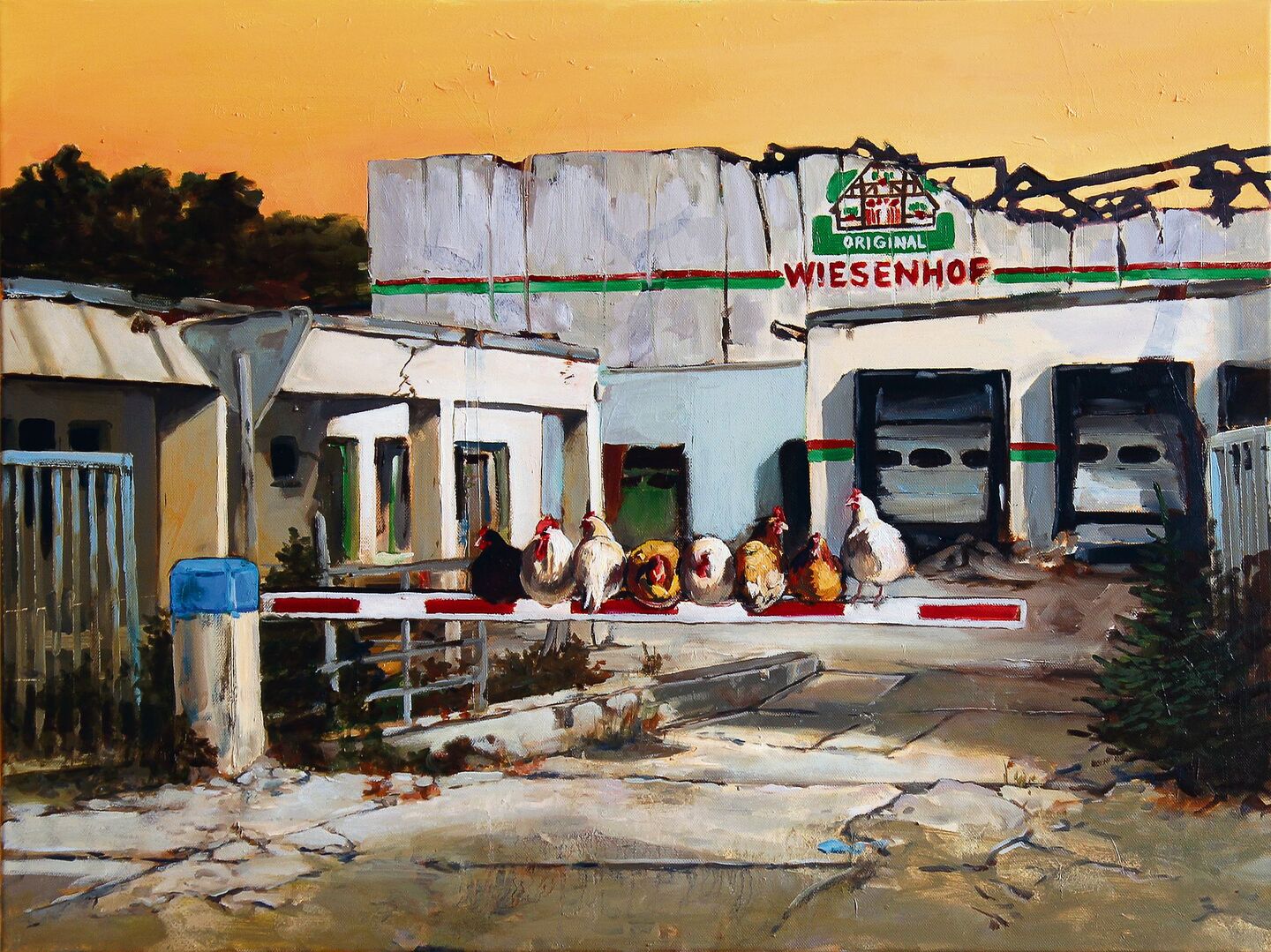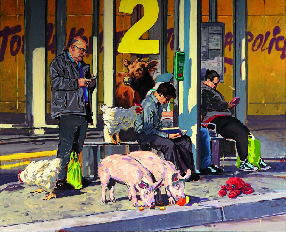 Im Titel «Animal Utopia» steckt zwar die Utopie drin, allerdings sind meine Bildwelten der heutigen Alltagswelt entlehnt und die Transformation hin zu einer zukunftsfähigen, klimagerechten Gesellschaft ist noch nicht vollendet. Die Frage nach guten Lebensbedingungen für Menschen und andere Tiere bleibt insofern in den Bildern noch offen. Grünere Städte ohne Autos etwa wären ja nicht nur für andere Tiere, sondern auch für uns Menschen Orte mit höherer Lebensqualität. Wenn sich auf meinen Gemälden, den Mastanlagen und Schlachthöfen entrückt, Kühe, Hühner und Schweine die von Menschen geprägten Räume erobern, geht es mir dabei zunächst auch um Irritation. Denn es gibt heute weitaus mehr Hühner und andere sogenannte Nutztiere als Menschen, aber wir bekommen sie kaum zu Gesicht. In meinen Bildern treten diese Tiere als handelnde Subjekte in Erscheinung und begegnen den Menschen auf Augenhöhe. Die heute vorherrschende Objektivierung dieser Tiere zu schieren Ressourcen und Waren wird so zurückgewiesen.