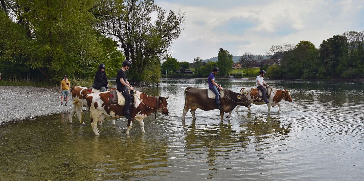Still stehen Stella, Cleopatra, Simphony, Milena, Marie-Louise und Giuliana im Rhein. DassMenschen auf ihnen sitzen, kümmert die Kühe nicht. Seelenruhig nimmt Marie-Louise einen Schluck frisches Flusswasser, während Stella immer wieder mit den Hinterläufen ins Nasse stampft. Das sei ein Zeichen, dass es ihr gefällt, erklärt Heinz Morgenegg, Landwirt auf dem Bolderhof in Hemishofen, Chef der Vierbeiner und Initiator des Kuhreitens. Die Kneippkur für die Kühe ist der Wendepunkt des Trips. Eine Stunde davor hat Morgenegg die TierWelt und eine Polterabendfeiernde Männergruppe in ihr Abenteuer eingeführt.