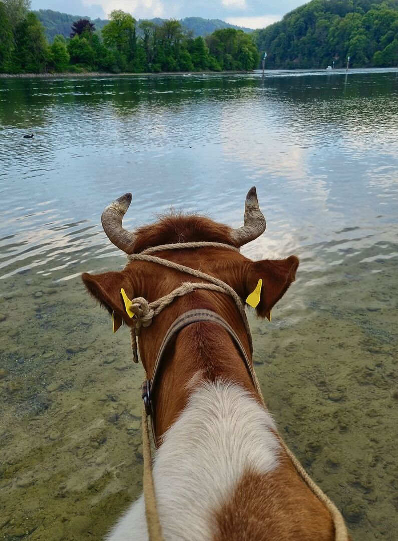«Hey, du bist die Chefin», ruft Nino der Reiterin zu. Diese aber hat gerade einen Lachanfall, weil sie glaubt, den Weg des Futters in Stellas Körper an den Oberschenkelinnenseiten zu spüren. Sie lässt Stella noch zwei, drei Büschel ausreissen, ehe sie richtig energisch wird. Und siehe da: Die Fleckvieh-Dame zuckelt los. Nur drei Minuten später steht Stella genüsslich kneippend im Rhein.