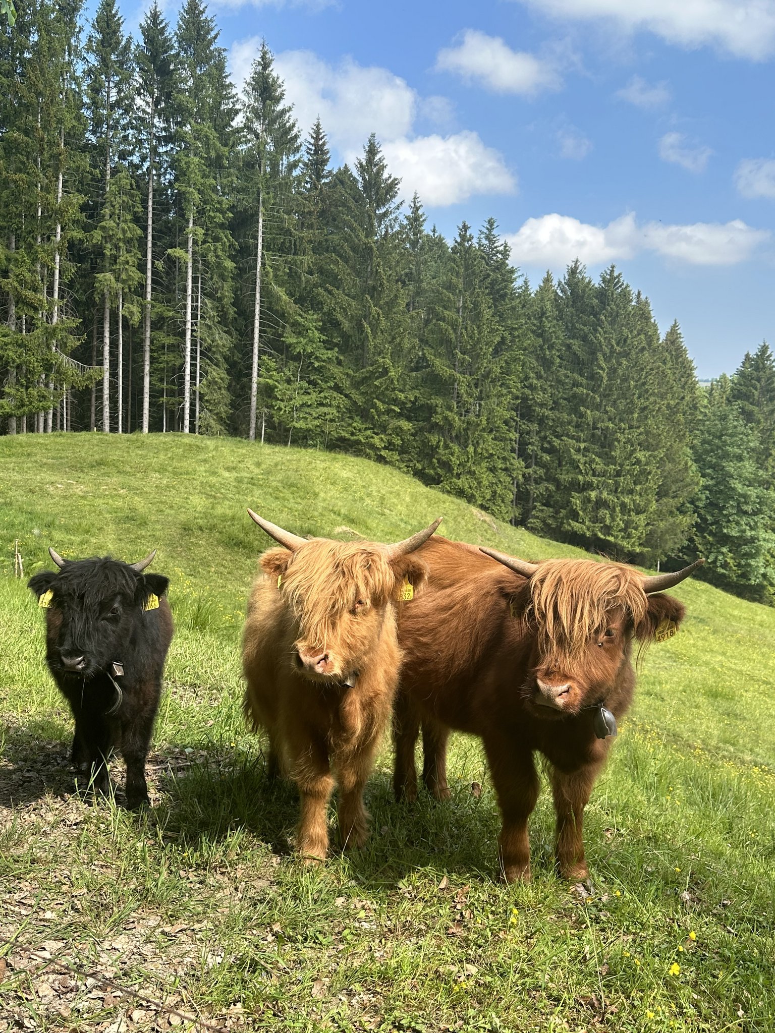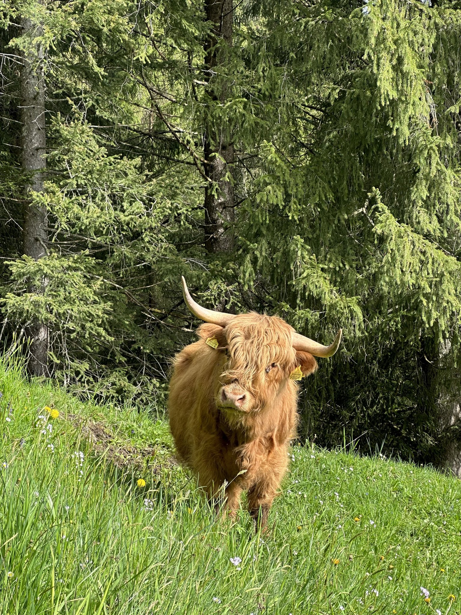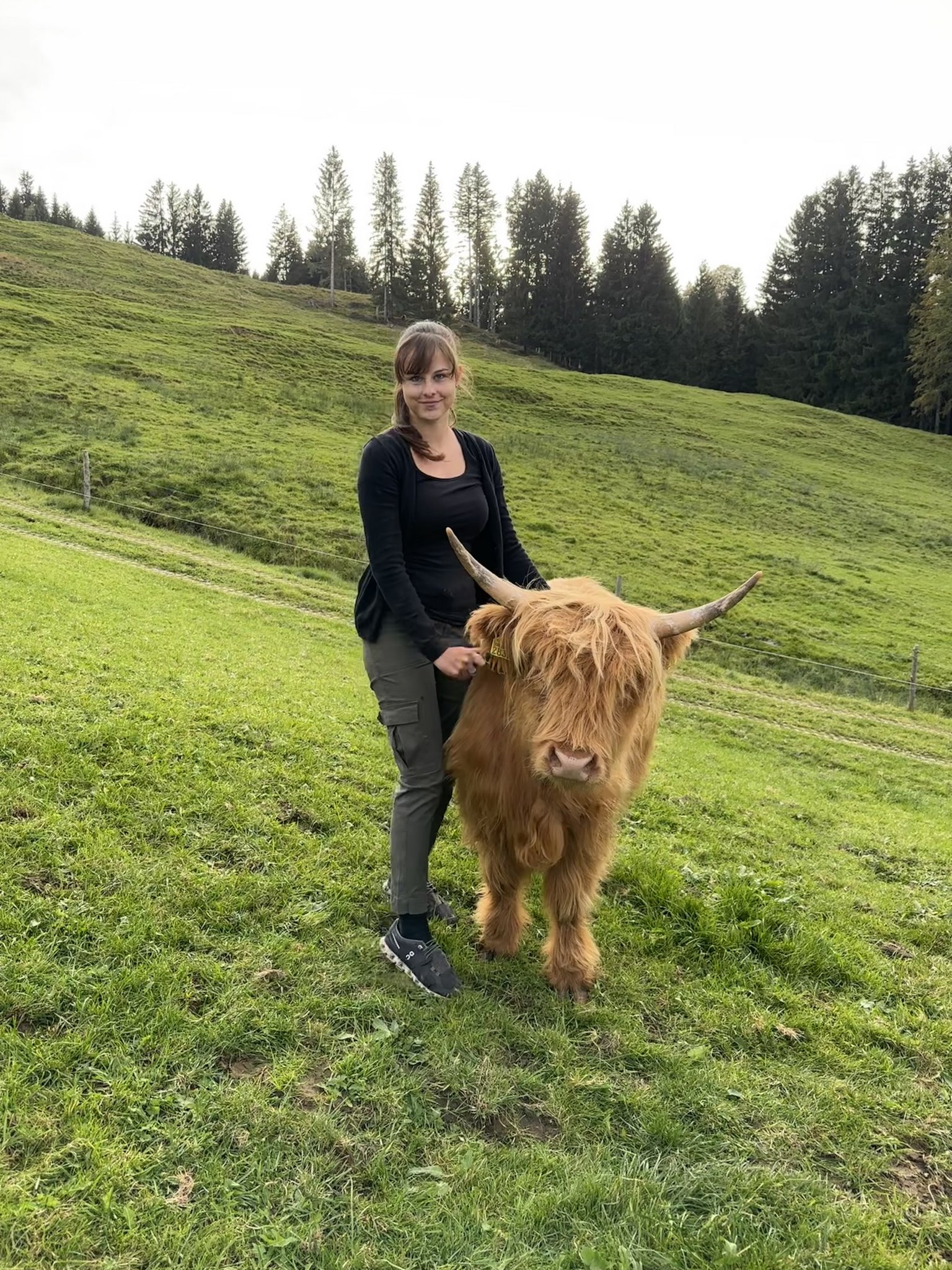 Die wuscheligen Schotten von Ramona Inauen, die zwischen einem halben und einem dreiviertel Jahr alt waren, als sie in die Schweiz kamen, sind zutraulich. «Sie waren bereits im jugendlichen Alter ganz ruhig und zahm, ich konnte auch ohne Probleme in die Herde rein.» Die beiden jüngsten Rinder gewöhnte die Tierfreundin sogar ans Halfter, sodass sie nun mit ihnen Spaziergänge machen kann. Bei den älteren Tieren möchte sie nichts erzwingen, aber ihre Kälbchen sollen mit der Halfterführigkeit vertraut gemacht werden.