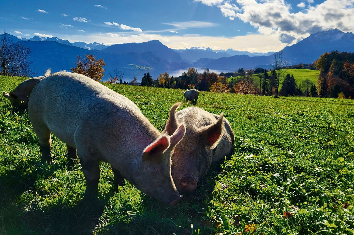 Steigt Ursula Küchler ins Schweinegehege, hat sie kaum eine ruhige Minute. Nicht nur die neugierigen Ferkel kommen aufgeregt grunzend angerannt, auch Zuchteber Julio freut sich auf eine Streicheleinheit. Auffordernd legt er sich vor Küchlers Füsse. «Da kommt man jetzt nicht mehr so schnell weg», sagt sie belustigt und krault die Schweine ausgiebig. Für die zehn Ferkel sind es die letzten Tage auf dem Panoramahof. Mit ihren knapp über 100 Kilogramm gelten sie bereits als schlachtreif. Immerhin hatten sie in ihrem sechsmonatigen Leben so viele Freiheiten wie kaum ein anderes Schwein. Eine Hektare Wiese und eine Hektare Wald umfasste ihr Gehege, das sie nur mit ihrer Zuchtmutter Amy und dem kuschligen Julio teilen mussten. Das ist ein Vielfaches dessen, was Schweinen in der üblichen Fleischindustrie zusteht. Rund ein Quadratmeter pro Ferkel gilt in der konventionellen Haltung als Mindestfläche. In der biologischen Schweinemast ist es beinahe das Doppelte – dazu kommt ein Auslauf, der sich jedoch meistens auf einen Betonboden beschränkt.