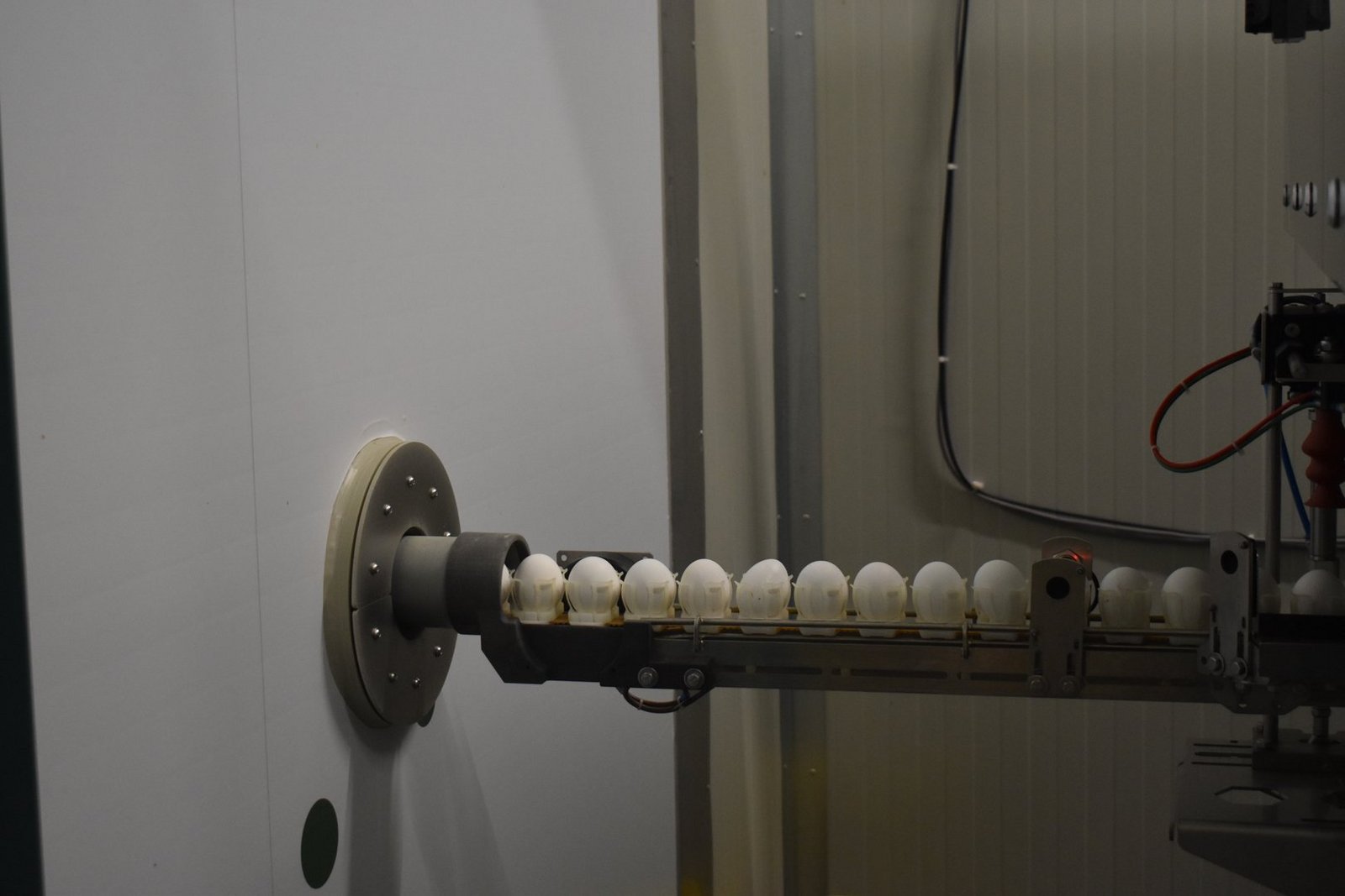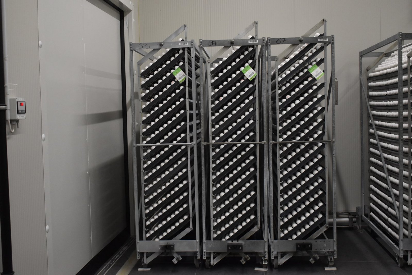 Nach der Lagerung bei einer Temperatur von 14 bis 18 Grad Celsius kommen die Eier in einen Raum, welcher auf 24 Grad vorgeheizt ist. Hier findet zudem eine Oberflächendesinfektion statt, um die Eier möglichst keimfrei zu halten.