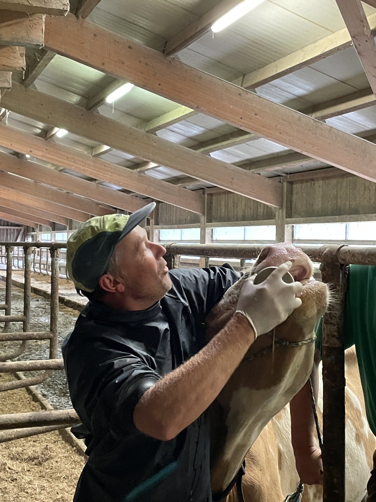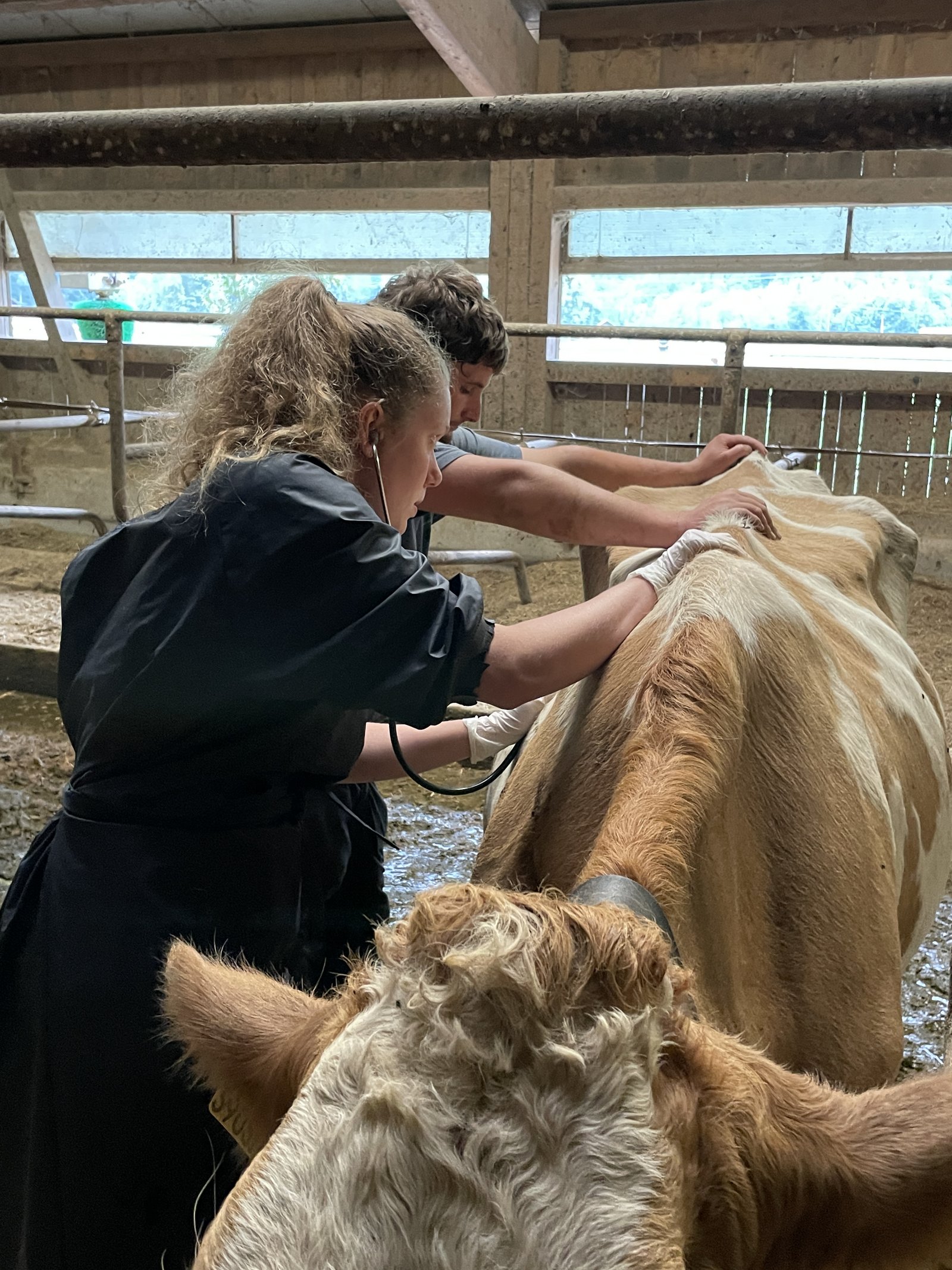 Die vierjährige, trächtige Tamina gibt ein jämmerliches Bild ab. Die Milchkuh hat stark Fieber, frisst nicht mehr und leidet unter Durchfall. Eva Fankhauser hat sich einen Untersuchungsmantel umgelegt, misst die Temperatur und hört die Lunge ab. 41 Grad Celsius und ein Rasseln auf der Lunge deuten tatsächlich auf eine Lungenentzündung oder Zeckenfieber hin. Nun kommt der schwierige Teil: Mit dem Ultraschall muss überprüft werden, ob das Kalb in einem normalen Entwicklungsstadium ist. Gelingen will dies noch nicht reibungslos. Der Arm der jungen Frau mit dem lockigen Pferdeschwanz steckt bis zur Achselhöhle in der Kuh, in der Hand hält sie den Ultraschallsensor. Doch eine Abbildung des Kuhinneren will sich partout nicht auf dem Monitor zeigen und zu allem Übel macht sich der Durchfall just in diesem Moment besonders gut bemerkbar. Auch hier gibt Bruno Lötscher seelenruhig Anweisungen. «Das ist wichtiges Learning by Doing, unser ganzes Studium ist sehr theoretisch ausgelegt», sagt Praktikantin Eva Fankhauser, die bei der zweiten Kuhuntersuchung ihres Lebens ganz schön ins Schwitzen kommt. Der erfahrene Tierarzt übernimmt es anschliessend, die Antibiotikaspritze anzusetzen und ein Pulver, das den Pansen wieder ins Lot bringen soll, einzuflössen. Mit etwas gutem Heu zum Kauen sollte es Tamina bald wieder besser gehen, versichert er zum Abschied dem jungen Landwirt.