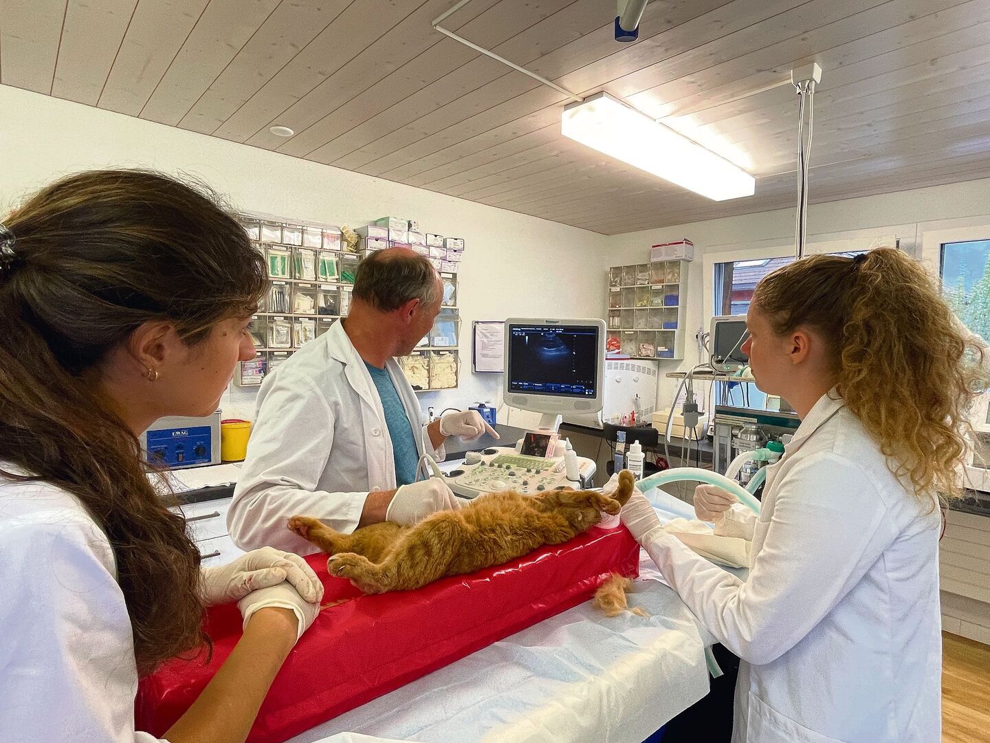 Endlich ist Max eingeschlummert und das Dreierteam kann sich an die Untersuchungen machen. Die junge Tessinerin, die noch vor wenigen Monaten mit ihren Eseln quer durch die ganze Schweiz marschierte, beginnt mit dem Ultraschallgerät den Bauchraum der Katze abzutasten. Die Blase ist schnell gefunden, bei der Niere wird es schwieriger. Bruno Lötscher steht mit Rat und Tat zu Seite. «Ich finde es schön und wichtig, junge Tierärztinnen beim Berufseinstieg zu begleiten.» Als Gegenleistung fliesse so das neuste Wissen aus den Universitäten in seine Praxis ein.