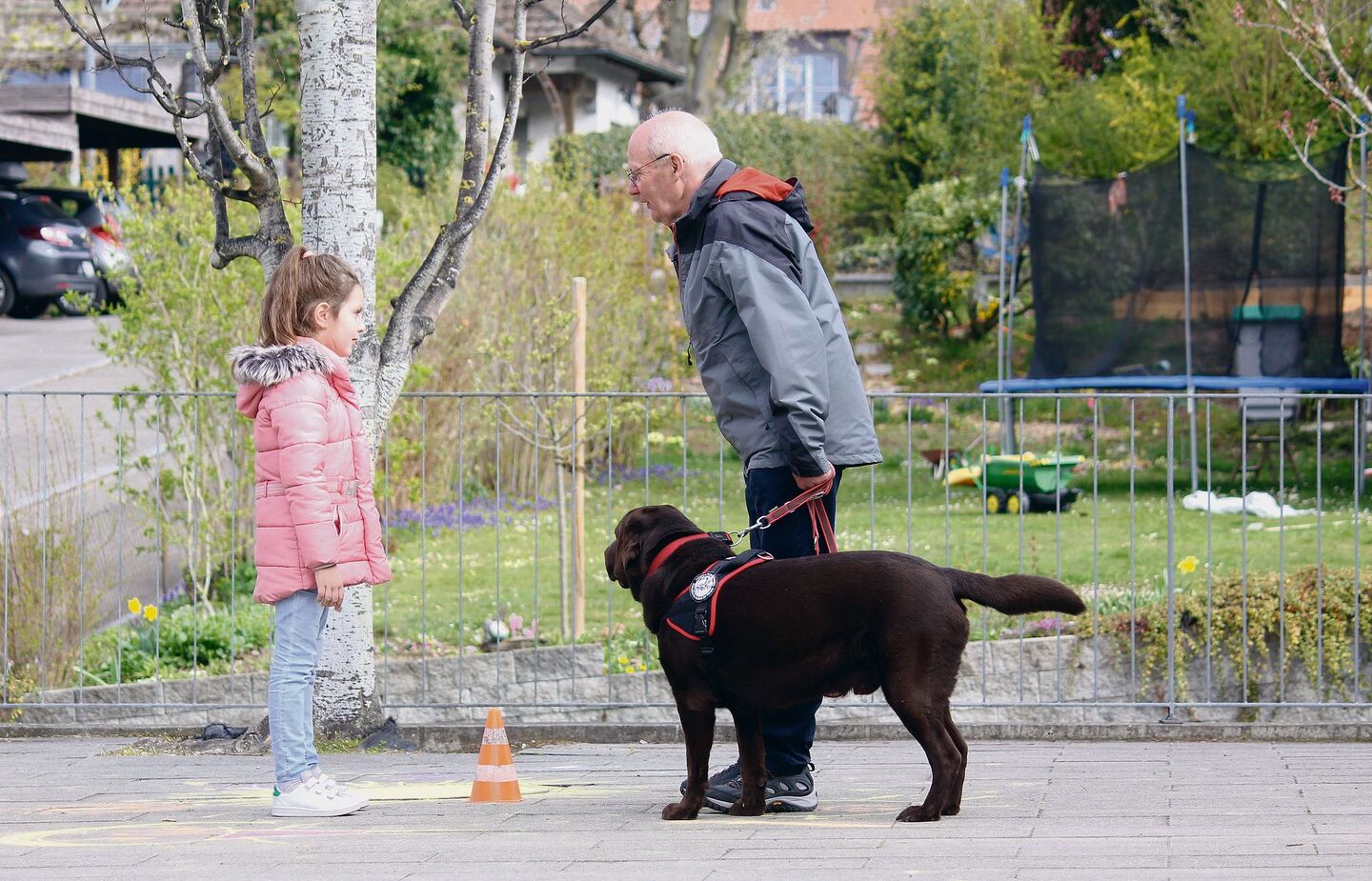 Nach so viel Theorie ist es für die Kinder – und auch für die Hunde – höchste Zeit für etwas Bewegung. Die zweite Kurshälfte findet auf dem Schulhof statt. Die Einsatzteams verteilen sich rund um den Kletterturm und leinen ihre Hunde an Zäune und Bäume. DieKinder bekommen es jetzt hautnah mit den Vierbeinern zu tun. Wobei: besser noch nicht ganz hautnah, Hund und Kind sollen sich erst einmal mit Abstand begegnen. Im grossen Bogen und ruhigen Schrittes sollen die Buben und Mädchen an den Hunden vorbeispazieren.