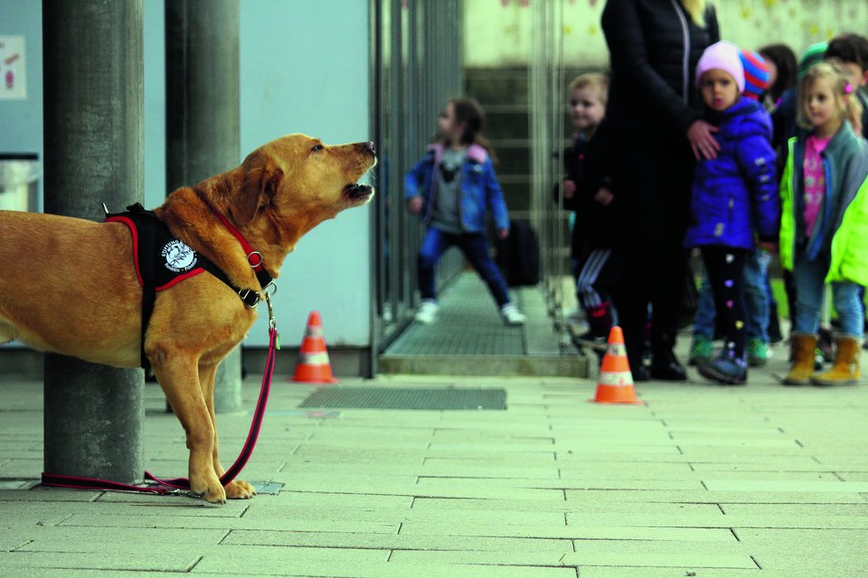 Etwas leichter fällt das Stillsitzen, wenn es etwas zu sehen gibt. Deshalb kommen nun die fünf Hunde und ihre Partner zum Einsatz. Golden-Dame Yuma apportiert zum Erstaunen der Kindergärtler ein rohes Ei, ohne es kaputtzumachen. Lagotto Mila lässt sich von ihrer Halterin mit blossen Handzeichen «Sitz», «Platz» und «Fuss» diktieren. Und Labradorrüde Leon erschnüffelt in Sekundenschnelle den Teebeutel unter einem Hundenapf – das Mädchen, das sich auch an der Übung versuchte, entschied sich unter dem Gekicher seiner Gspänli für den falschen Napf.