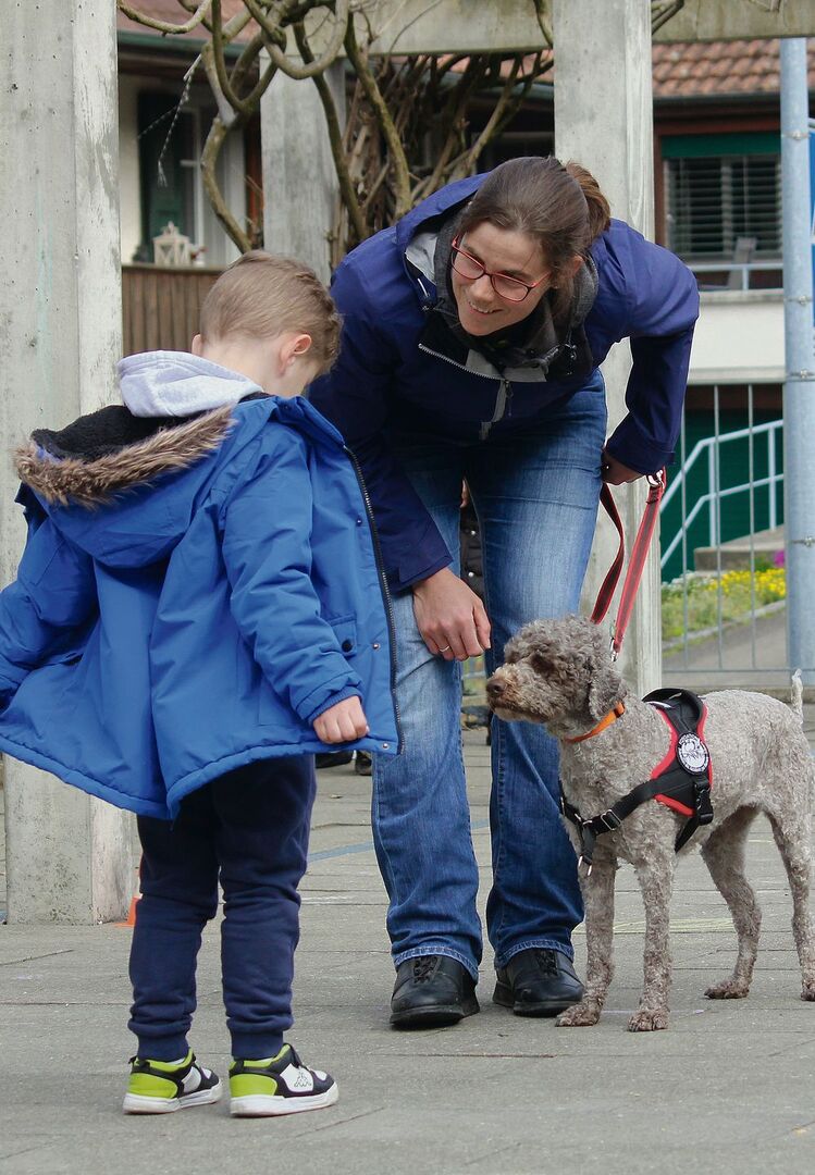 Im Anschluss dürfen sich die Hunde endlich ihre Streicheleinheiten abholen. Aber erst, nachdem die Kinder Herrchen oder Frauchen gefragt haben: «Darf ich Ihren Hund streicheln?» Da müssen die Kindergärtler auch ab und an mal eine Enttäuschung akzeptieren, wenn es etwa heisst: «Nein, heute lieber nicht. Leon hat Bauchschmerzen.»