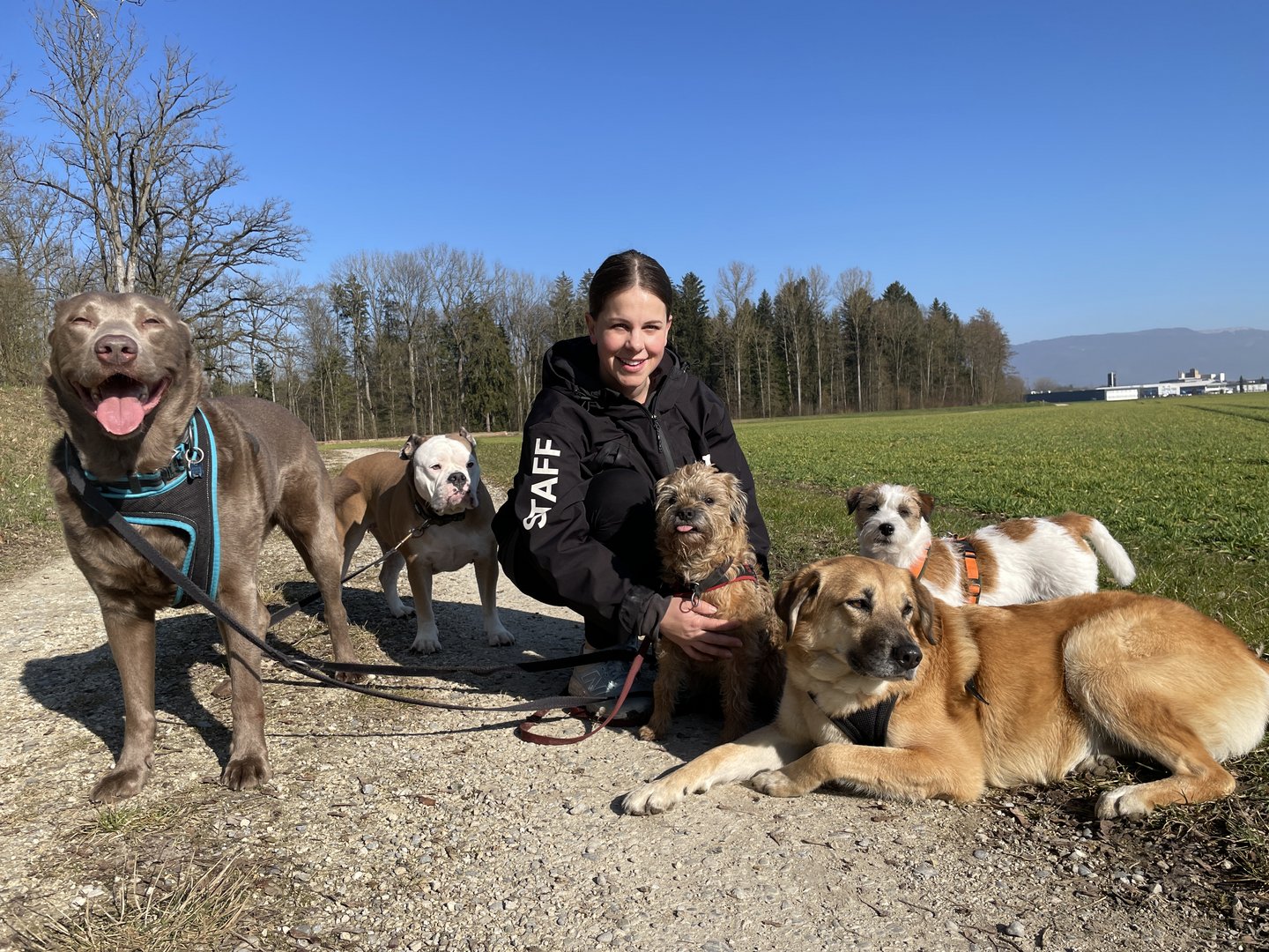 Hunde, die etwas mehr Ruhe brauchen, läufig sind oder gerade eine Operation hinter sich haben, werden separat gehalten. Möglich machen das mehrere abgetrennte Innen- sowie Aussenbereiche. «Wir schauen auch darauf, dass eher die grossen Hunde zusammen sind und die kleinen in einer eigenen Gruppe», erklärt von Aesch. «Für die älteren Semester machen wir auch ein Rentnerprogramm.» Faktisch bedeutet das, dass nicht jeder Hund alle Spaziergänge durchziehen muss. Gassi-gehen muss aber für alle drin liegen. «Bei richtig schlechtem Wetter ziehe ich dann manchmal fünf Hunde hinter mir her», sagt sie scherzhaft.