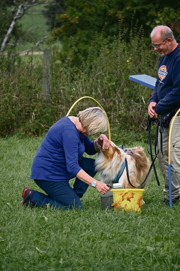 Die Ersatzjagd gehört zum Tagesritual, das in Arnolds Hundekursen grossgeschrieben wird. Nach der Futterbeutelsuche dürfen die Hunde ihre Futterration fressen. Anschliessend geht es an die Pflege und die Vorsorge. «Fasst euren Welpen an. Auch die Pfoten, die Ohren und das Maul sollten abgetastet werden», sagt sie zu den Vieren im Kreis. «Damit macht ihr das Leben für alle stressfreier. So wird der Tierarztbesuch nicht zu einer Zitterpartie», erklärt Arnold. Wichtig sei, dass die Trainingseinheiten kurz bleiben. Zwei bis drei Einheiten am Tag von jeweils fünf bis zehn Minuten seien ideal, erklärt sie. «Und lasst die fünf gerade – manchmal ist weniger mehr», fügt die Hundetrainerin mit einem Augenzwinkern hinzu.