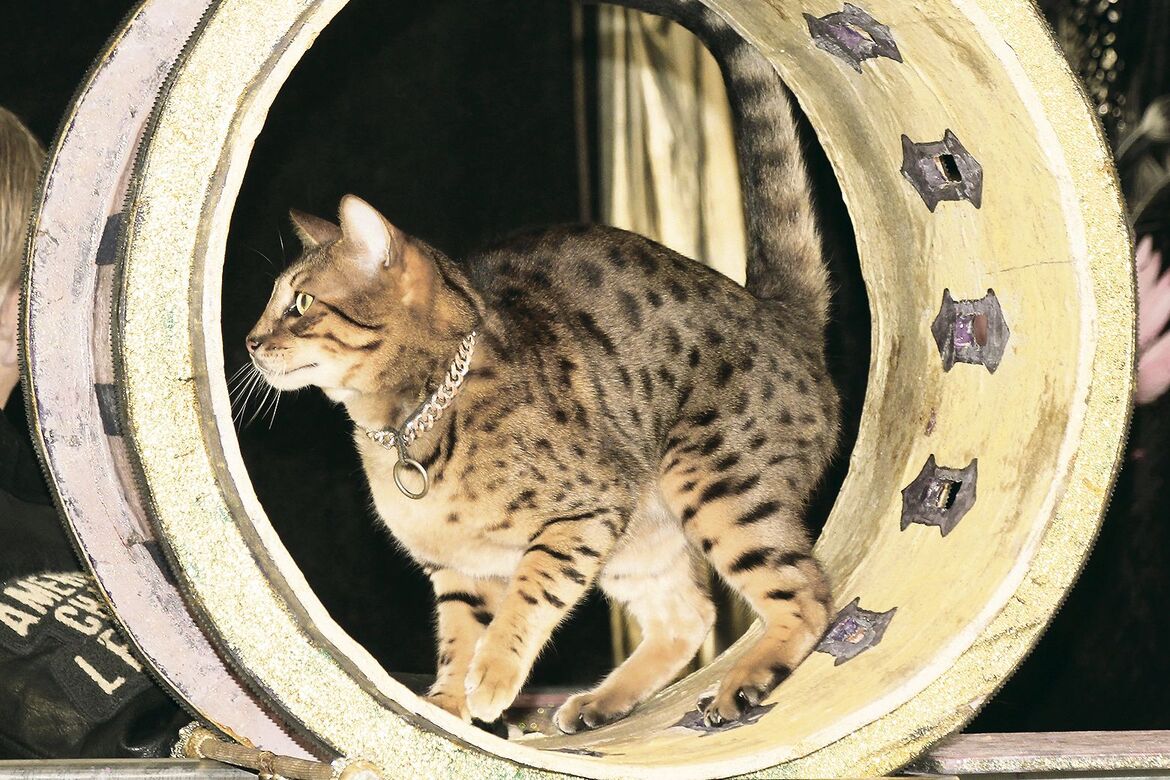 Heini Gugelmann öffnet die Behälter und heraus springen exotische Katzen, die schnurren, miauen und ihre Schwänze in die Höhe strecken. In ihrem Blick vermischen sich Neugierde, Tatendrang, Wildheit und Abenteuer. Auf den Zuruf von Gugelmann hin springen sie auf vier Postamente. Kaum gelandet, strecken sie die Schwänze in die Höhe. Wie Tiger stehen sie auf die Hinterbeine, als die Melodie «Einzug der Gladiatoren» spielt – und werden für ihren Einsatz mit Fleischhäppchen belohnt. Bei Passagen aus der Oper «Carmen» springen sie tollkühn von einem Podest auf das andere und sogar durch Reifen. Der Gipfel der Kunst ist der Sprung einer Katze durch einen vollständig mit Papier bespannten Reifen. Eine Katze balanciert zu einer Barkarole auf einer grossen, rollenden goldenen Kugel, und zum Bolero vollführen die vier tierischen Artisten das Walzé, sie wenden sich um sich selbst. Als Höhepunkt zaubert der Tierlehrer aus einem Kistchen zwei zahme Farbratten, die zusammen mit den Katzen über eine Stange balancieren.