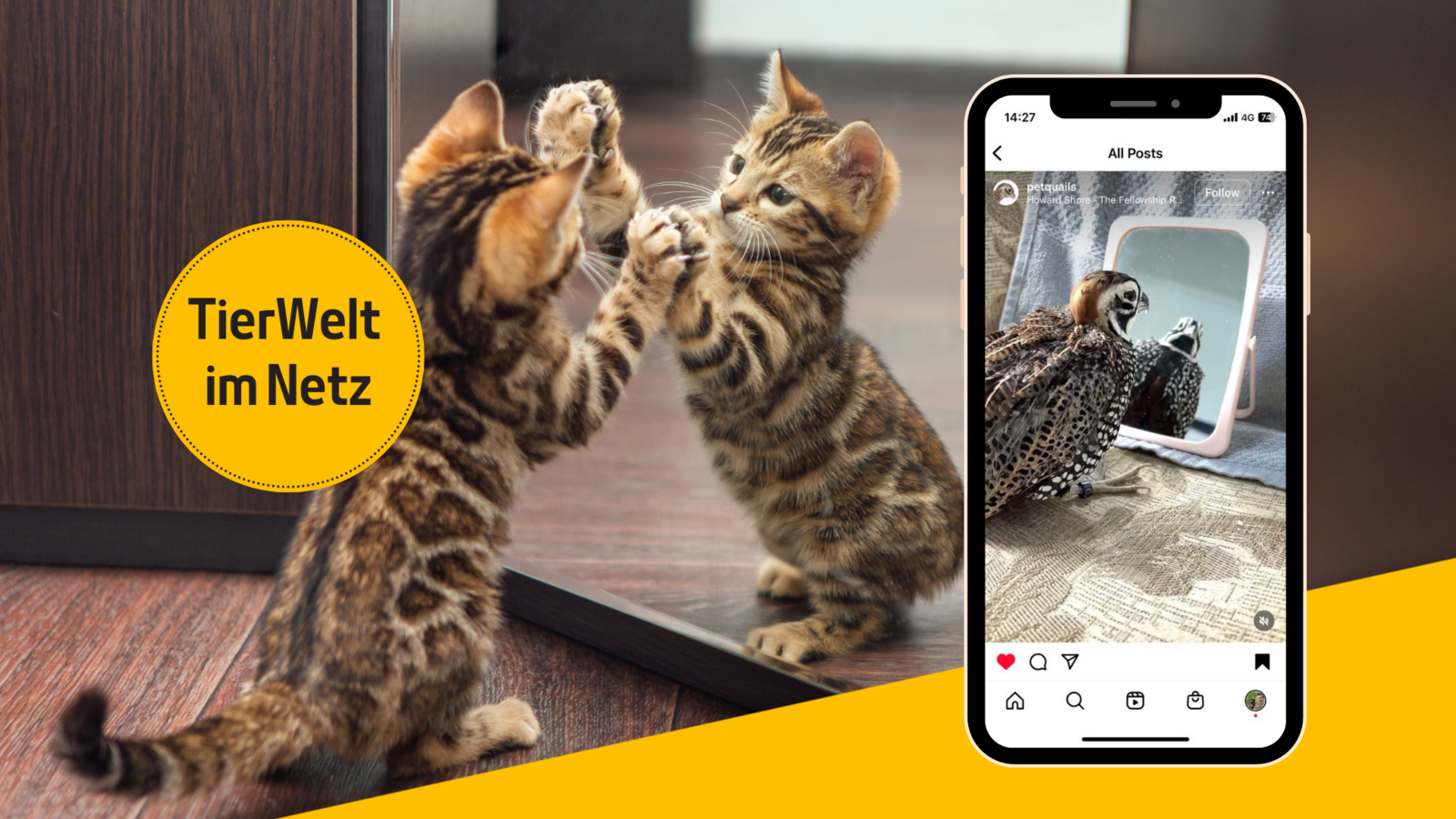 Menschen können sich im Spiegel selbst erkennen. Bei Tieren hingegen ist man sich nicht immer sicher. Diverse Studien und Wissenschaftler versuchen mit dem «Spiegeltest» nachzuweisen, ob gewisse Tierarten tatsächlich die eigene Reflektion erkennen können. Dabei wird ein Tier mit einer Markierung (z.B. einem Farbfleck) am Körper versehen, welche das Tier nur sehen kann, wenn es in einen Spiegel schaut. Verhält sich dann das Tier so, dass es registriert, dass der Farbfleck am eigenen Körper ist, wurde der Spiegeltest bestanden. Die Tiere versuchen dann oftmals den Fleck zu entfernen oder zeigen darauf.