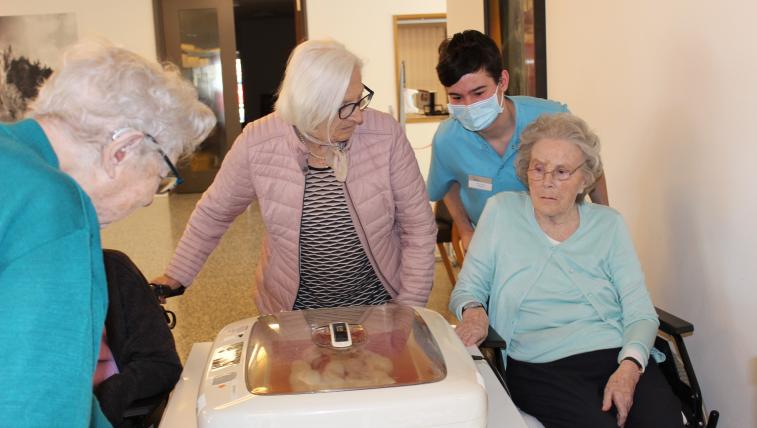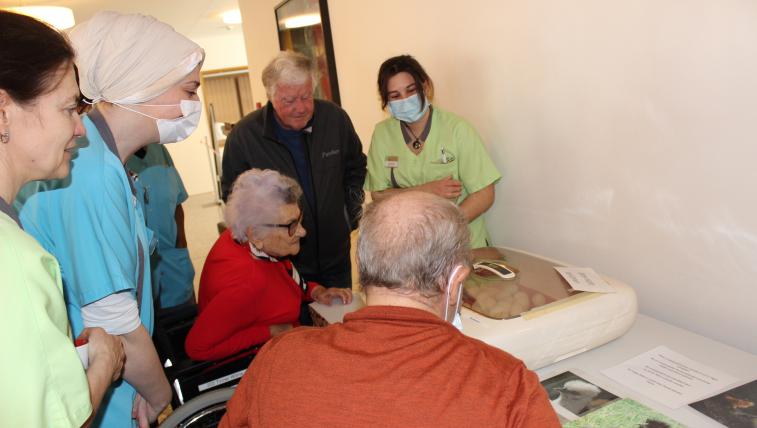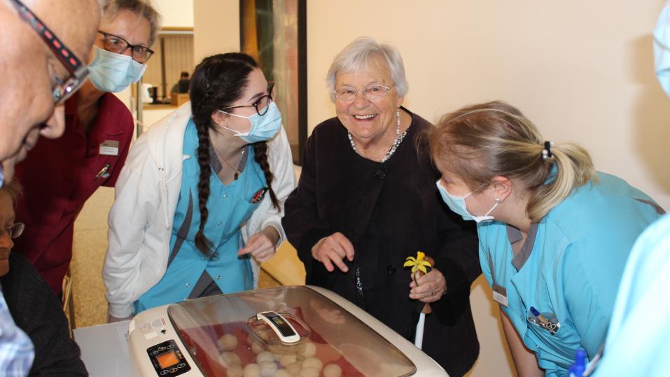 Der Standort des Brutapparats wurde bewusst sehr zentral bei der Cafeteria zwischen Haupteingang und Lift gewählt. So schauten viele Senioren spontan vorbei, um zu sehen, ob sich noch alles ruhig verhalte. Für viele von ihnen war das Ausbrüten im Inkubator etwas ganz Neues. Einige erinnerten sich noch an früher, als die Glucke mit ihren Eiern für die Brutzeit in den Estrich gebracht wurde – wohl zum Schutz vor Katzen und anderen Eierräubern. Sobald die Küken dann geschlüpft waren, wurden diese früher oft in die gute Stube gebracht. Da war es warm genug. Einige erinnerten sich noch an die herzigen Federknäuel, die sie dannzumal auch in den Händen halten durften.