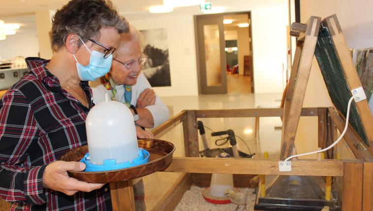 Als die Frühschicht der Putzequipe zur Pause am Brutapparat vorbeiging, begann das erste Ei, sich zu bewegen, und das erste Bibeli erblickte das Licht der Welt. Jetzt ging es rund um den Brutapparat zu und her wie in einem Ameisenhaufen. Das Hauswirtschaftsteam dokumentierte alles mit dem Handy. Einige Senioren liessen sich im Rollstuhl zum Geschehen bringen, andere machten nur einen kurzen Spaziergang ausser Haus, um ja nichts zu verpassen. Die frisch geschlüpften Bibeli lagen am Anfang noch nass und erschöpft im Inkubator. Viele Bewohner sorgten sich schon, ob es diesen auch gut gehe. Aber nach einiger Zeit hatten sich die Küken von den Strapazen erholt und hüpften bereits umher. Als sie dann vollständig trocken waren, konnte Eggler die frisch geschlüpften Seidenhuhn-Küken ins warme Kükenheim bringen.