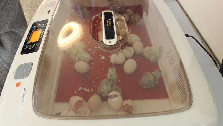 Bis am Abend waren neun kleine Federbällchen aus den 22 Eiern geschlüpft. Der Brutapparat wurde noch über Nacht für etwaige Nachzügler belassen. Und tatsächlich: Am nächsten Morgen schaffte es auch noch Küken Nummer 10 aus der Eierschale. Aber das wars. Die anderen Eier blieben ganz und der Brutapparat wurde abgestellt.