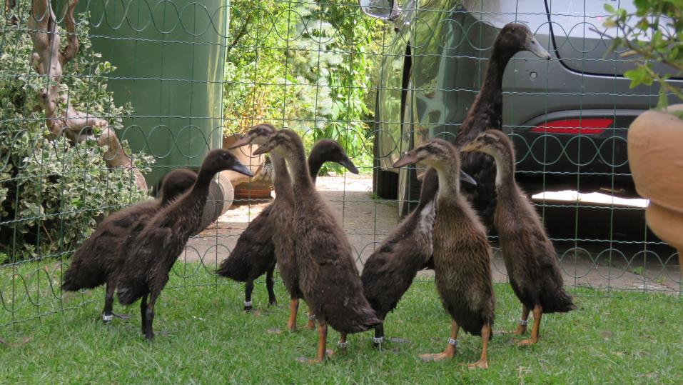 Von jeder Farbe führt Oechslin vier verschiedene Zuchtlinien. So stellt sie sicher, dass die Tiere gesund und schön bleiben. Damit sich nur die jeweils gewünschten Paare miteinander fortpflanzen, greift die erfahrene Züchterin zu einem Trick: Diejenigen, die sich nicht paaren sollen, vermietet sie, damit sie in anderen Gärten die Schnecken vertilgen. Zur Zeit unseres Besuches waren zehn von Oechslins Laufenten in einem solchen Einsatz unterwegs.