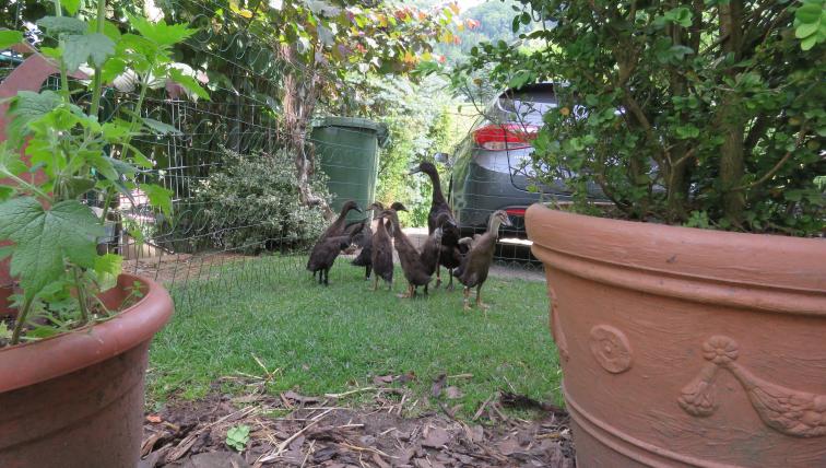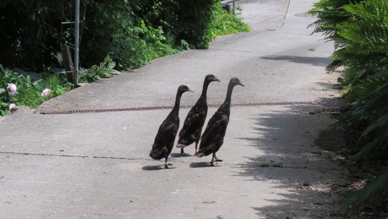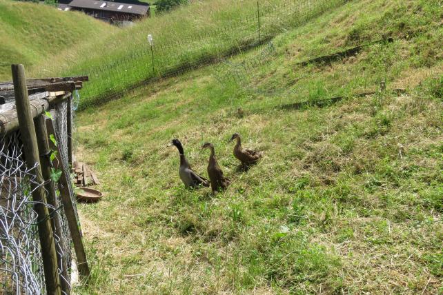 Einer der schwarzen Erpel möchte jetzt in sein Häuschen. «Das Weibchen, das darin brütet, wird ihn gleich wieder rausschmeissen», prophezeit die Oechslin – und so ist es auch. Bereits einige Sekunden später hat die Ente den Erpel wieder vor die Tür gesetzt. So watschelt dieser halt wieder mit seinen Kumpels durch den Garten. Umherlaufen lassen kann Oechslin ihre Enten ohne Sorge, denn bis zur Strasse hinunter gehen sie nicht.