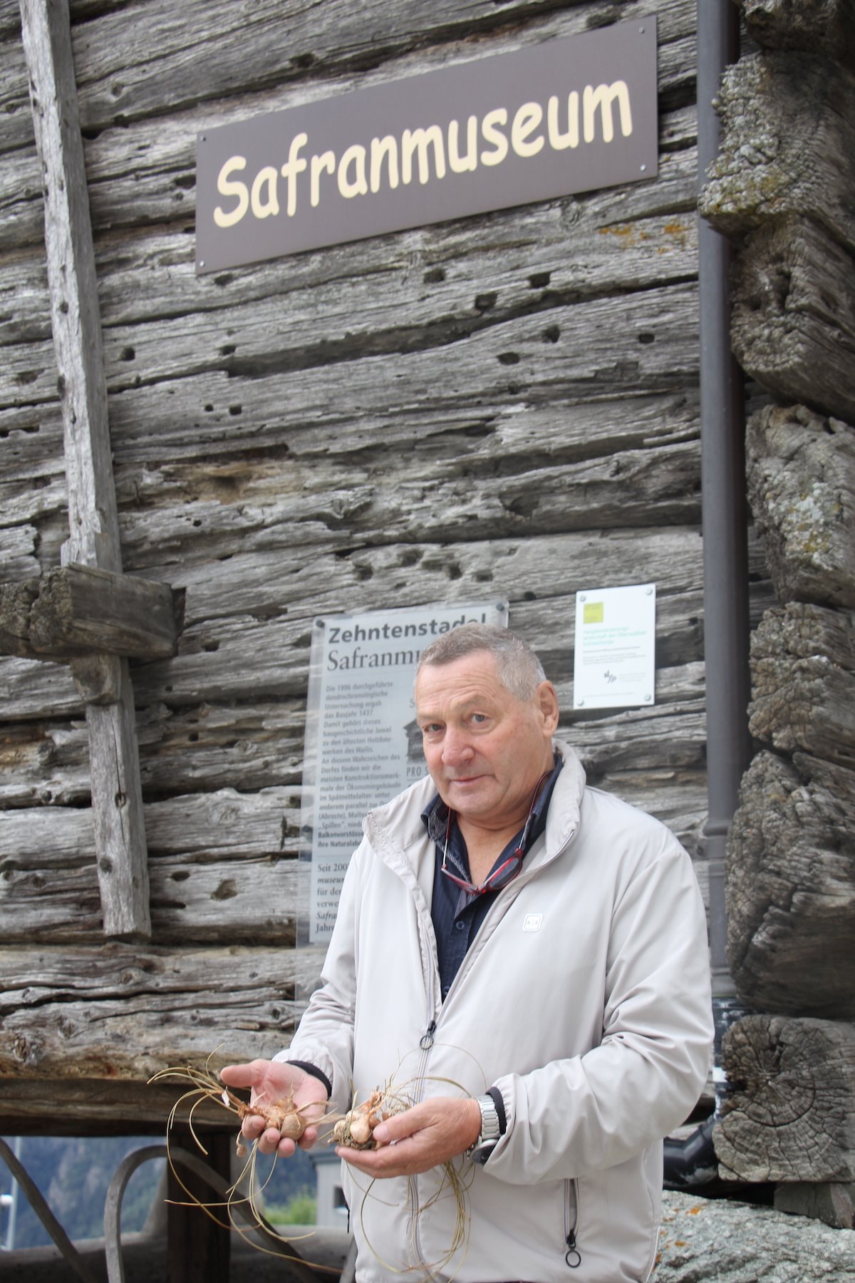 «Das hier sind die alten Anbauflächen für Safran», erklärt German Jossen und zeigt auf kleine Äcker unter ihm. Er könne sich gut daran erinnern, wie seine Grosseltern hier bereits Safran angebaut hätten. «Mein Grossvater trug die mit Safranblüten gefüllte Tschiffra nach Hause.» Dort habe man dann am selben Abend in mühsamer Kleinarbeit die Narben aus den Blüten gezogen und sie zum Trocknen ausgelegt. Als Zwölfjähriger habe er seinem Vater bei der Ernte geholfen. «Als Kind schätzte ich allerdings Safran kaum.» Das ist heute ganz anders. German Jossen kümmert sich ehrenamtlich während seiner Freizeit um Safran. «Er ist mein Haupthobby», sagt er und schmunzelt. Jossen ist nicht nur nebenamtlicher Safranbauer, sondern auch Meister der Safranzunft. «Wir wollen den Safrananbau in Mund erhalten und bekannt machen», sagt der 67-Jährige. Als sein Grossvater mit der Tschiffra, dem Rückentragkorb, vom Feld ins Dorf Mund mit den kleinen, dunklen Holzhäusern zurückging, führte noch keine Strasse vom Tal ins Dorf hinauf. Erst 1977 wurde sie gebaut. «Dem Strassenbau fielen viele Safranäcker zum Opfer», erzählt der in Mund aufgewachsene German Jossen.