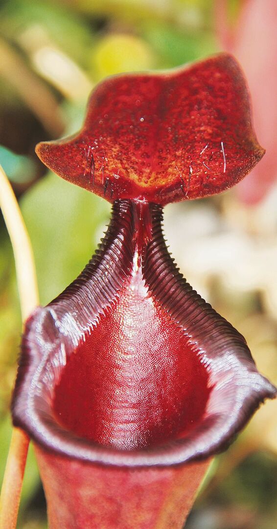Was aber noch viel verwunderlicher ist, sind die grünen bis rötlichen Kannen mit halb offenen Deckeln, die an langen Stängeln hängen. Sie wachsen aus den Blattspitzen. Die Madagaskar-Kannenpflanze gedeiht als Strauch, bedient sich aber des dürren Geästs auch als Stütze, um sich rankend in die Höhe zu arbeiten. In der Nähe erstreckt sich ein Sumpf mit schwärzlichem Wasser. Hier finden die Wurzeln der Pflanze kaum Nährstoffe. Sie hilft sich anderweitig und fängt Insekten mit ihren auffälligen Kannen. Dabei geht sie tückisch vor.
