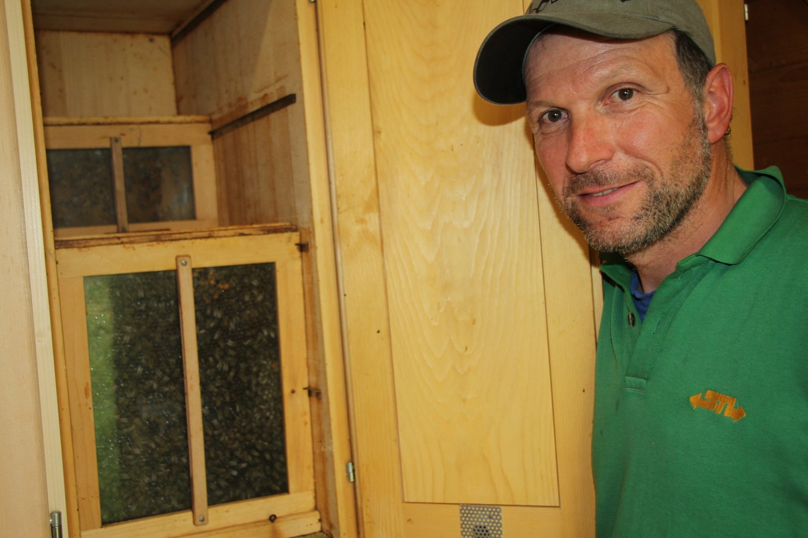 Ruedi Lehmann stapft nun von den Fluglöchern weg um das Bienenhaus herum, geht hinein. Sein Gesicht strahlt. Er sagt: «Es riecht gut hier.» Ein süsslicher Duft, ähnlich einem Gemisch aus Blüten und Honig, liegt in der Luft. Der Imker öffnet einen Kasten, nimmt den schützenden und wärmenden Schaumstoff weg und blickt durch eine Scheibe auf die Wabe voller Bienen. Eine einzelne schwirrt im Kasten frei umher. Ruedi Lehmann packt sie an den Flügeln, öffnet unten eine Klappe und schiebt sie sanft zurück in den Stock. Wahrlich, ein richtiger Bienenflüsterer!
