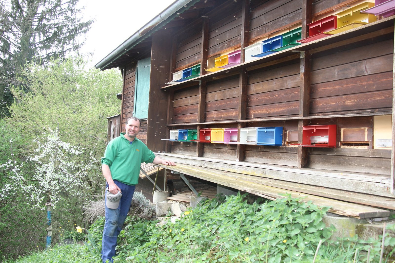Das verwunderte Stirnrunzeln ob seiner Aussage verschwindet spätestens dann, als er sich für ein Foto direkt vor die Fluglöcher seines Bienenhauses stellt. Er erzählt seelenruhig weiter, rundherum fliegen an diesem sonnigen Frühlingstag seine Bienen aus den Fluglöchern ein und aus. «Die Carnica sind sanfte Bienen, bringen einen guten Honigertrag und sind schwarmträge», erklärt Ruedi Lehmann.