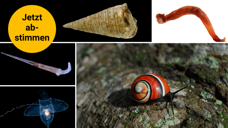 Wen wählen sie zum besten Weichtier 2022? Den zahnförmigen Kahnfüssler, die zähe Sedimentschnecke, den schönen Seeschmetterling, die Kubanische Landschnecke mit ihren schönen Häuschen oder den kleine Prachtkerl den Seeschiffsbohrwurm?