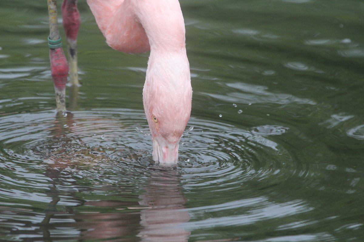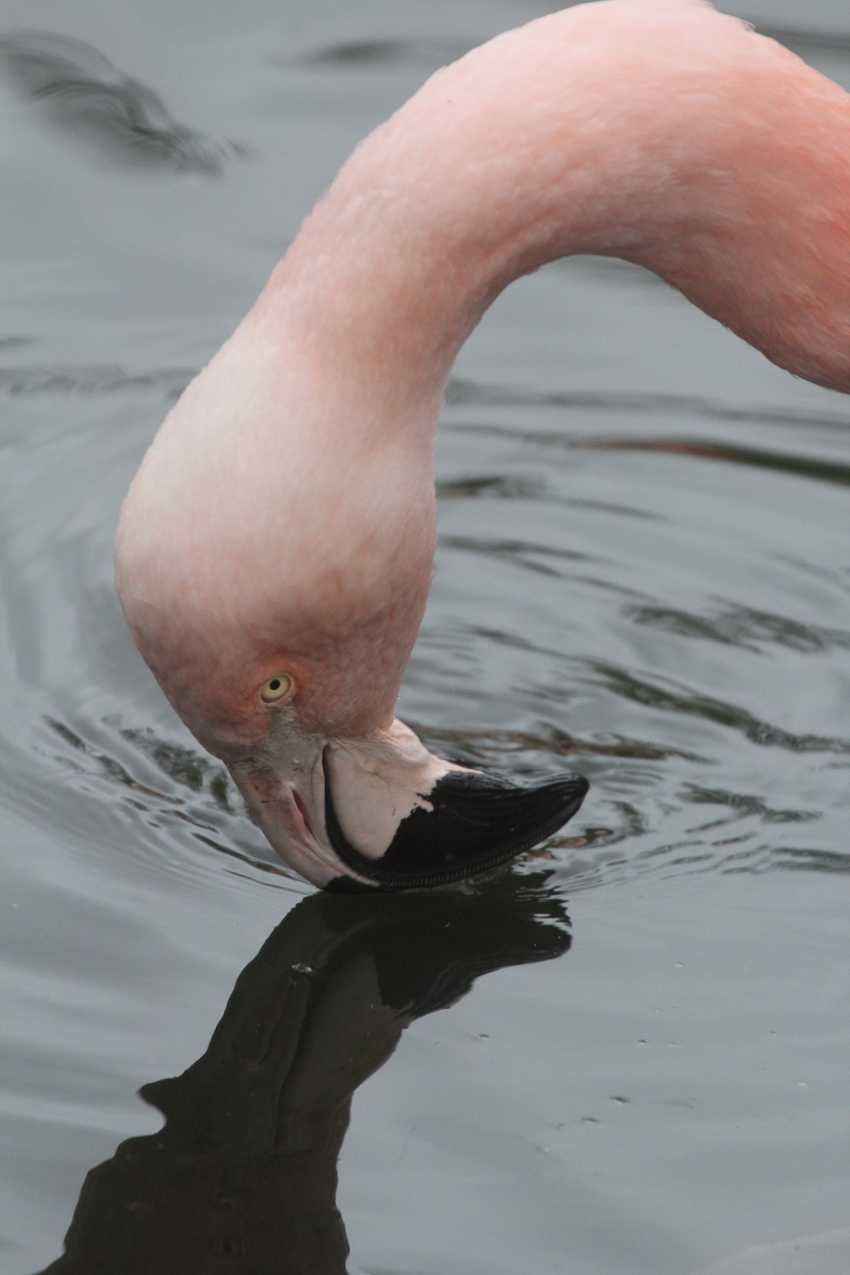 Der Flamingo zieht bei nur leicht geöffnetem Schnabel seine dicke, fleischige Zunge zurück, sodass im Schnabel ein Unterdruck entsteht und das Wasser nach innen strömt. Nun schliesst der Flamingo den Schnabel und bewegt die Zunge nach vorn, sodass das Wasser wieder aus dem Schnabel herausgepresst wird. Die Nahrungsteilchen, wie eben die Salinenkrebschen, bleiben in den Lamellen hängen. Zieht der Flamingo die Zunge erneut zurück, werden sie von den hornigen, stachelartigen Zungenfortsätzen in die Mundhöhle befördert. Gleichzeitig strömt wieder Wasser ein.