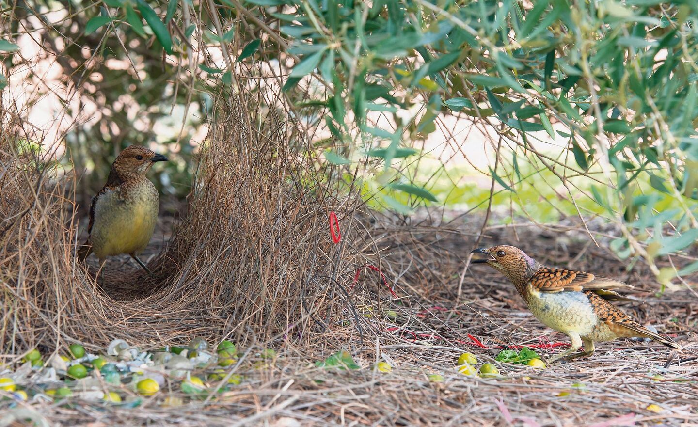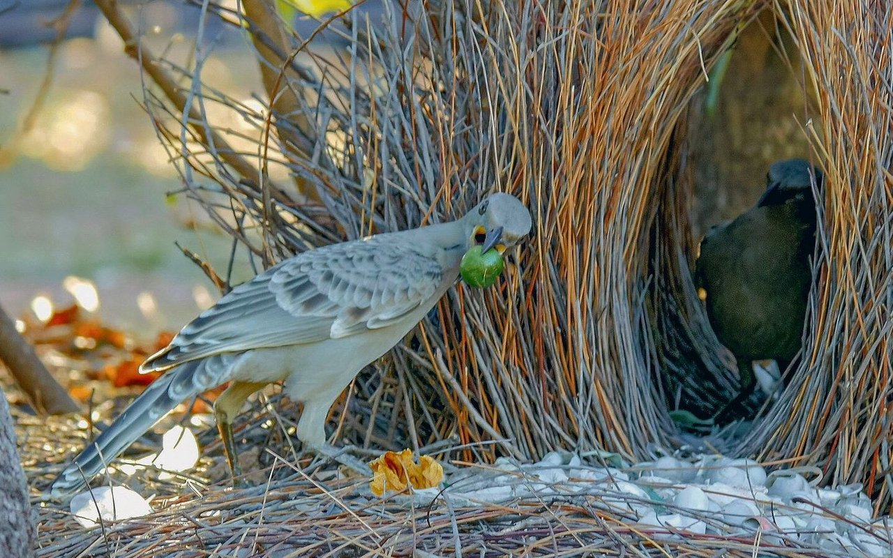 Gerade Vögel betreiben oft einen riesigen Aufwand, wenn es um den Bau von Nestern geht. Bei manchen bleibt es nicht bei einer ausgefallenen Architektur, auch ein passender Vorgarten wird angelegt. Männliche Vertreter der Laubenvögel (Familie Ptilonorhynchidae) schmücken einen feinsäuberlich hergerichteten Vorplatz mit allerhand Objekten, um paarungswillige Weibchen anzulocken. Am besten erforscht istder in Australien beheimatete Seidenlaubenvogel (Ptilonorhynchus violaceus). Er säubert den Waldboden rund um den Balzplatz und baut eine Art Laube, die aus zwei Wänden aus Zweigen besteht, sodass in der Mitte ein Gang entsteht.