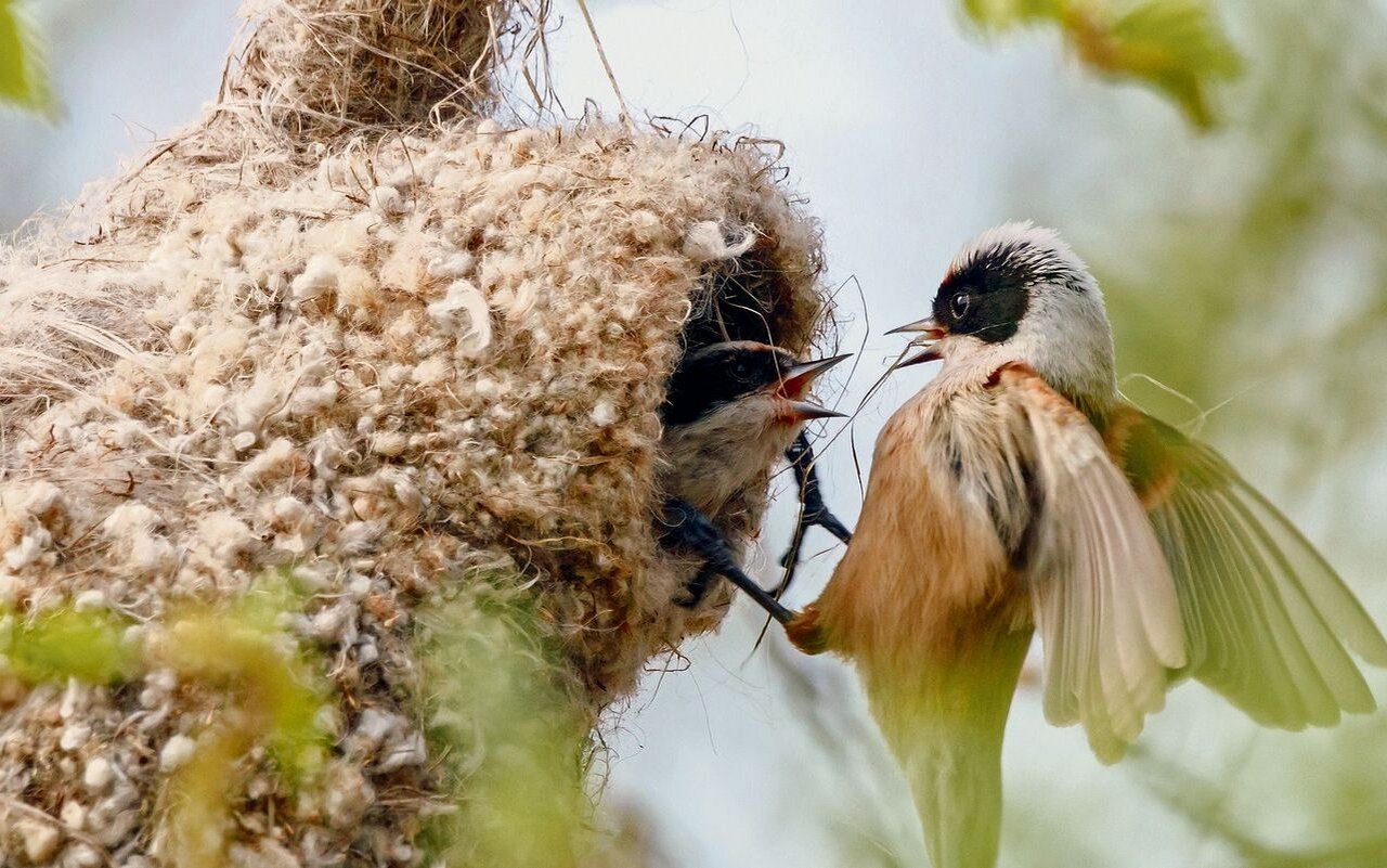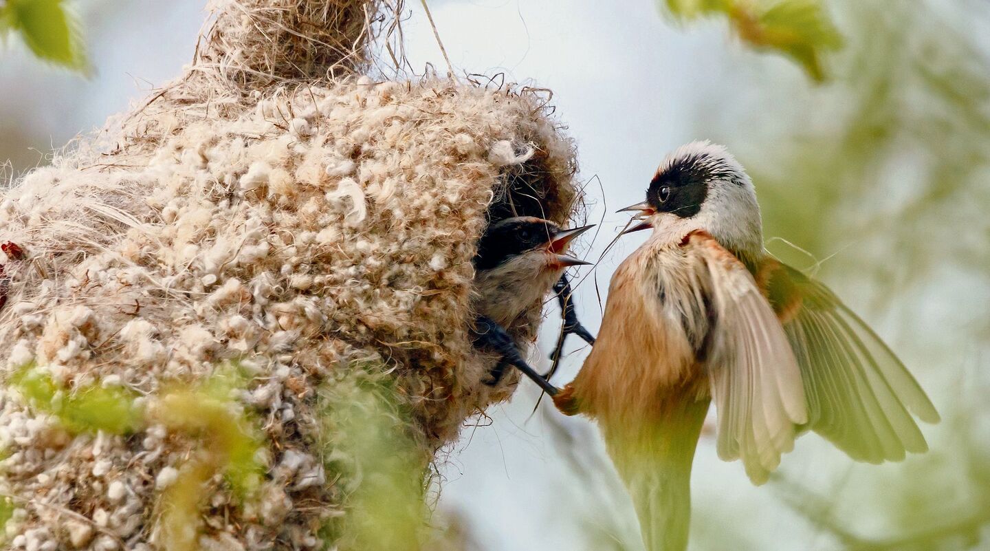 Rundliche Nester aus Halmen baut auch die bei uns seltene Beutelmeise (Remiz pendulinus). Den Namen erhält sie durch die Beutelform des Nests, das etwa 25 Zentimeter lang und 17 Zentimeter breit ist. Beim um die 20 Tage dauernden Bau des Nests beteiligen sich sowohl das Männchen als auch das Weibchen. Nachdem die Jungen geschlüpft sind, verlässt einer der Elternteile jedoch die Brut, sodass das zurückbleibende Tier praktisch alleinerziehend ist.