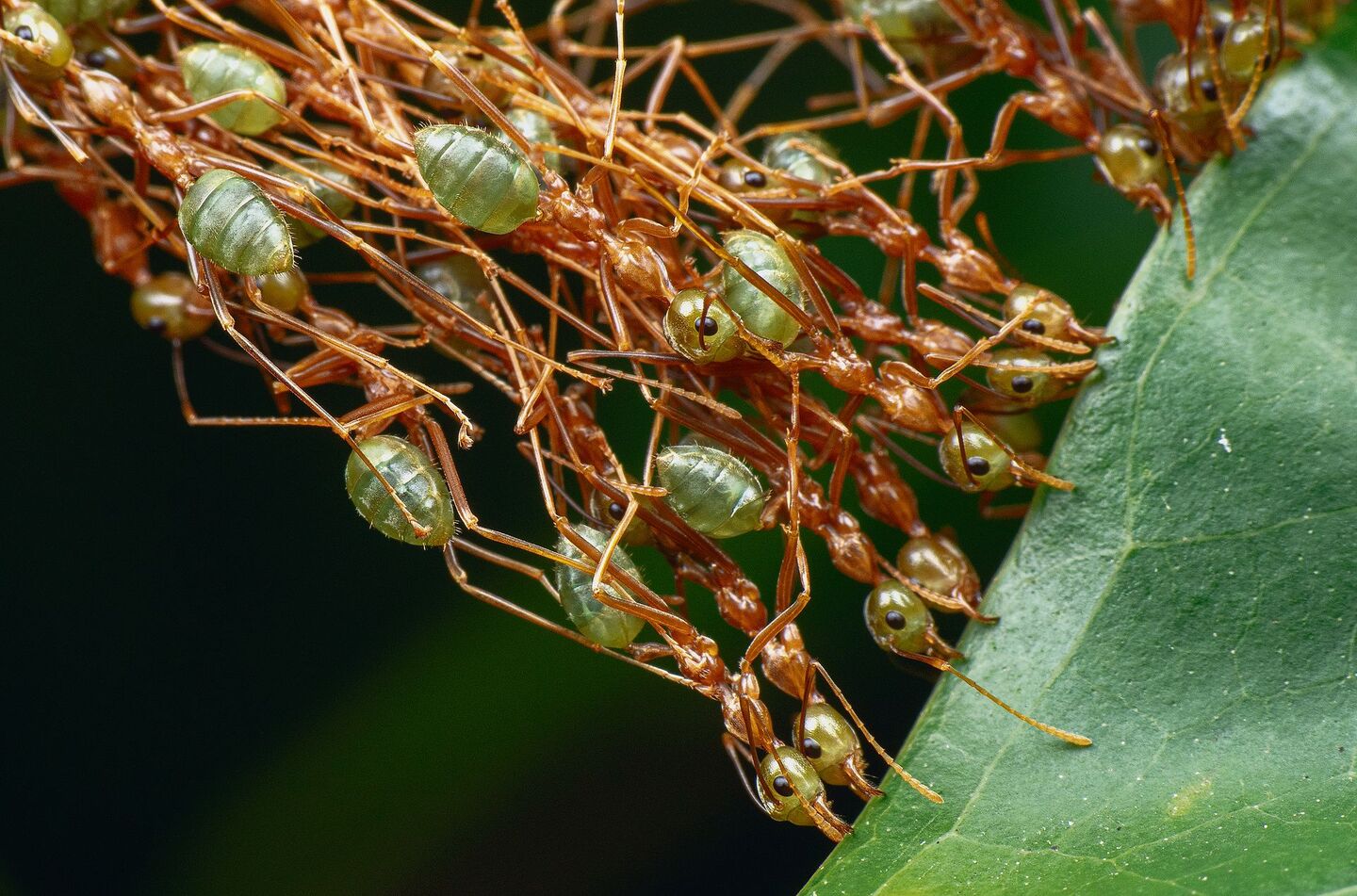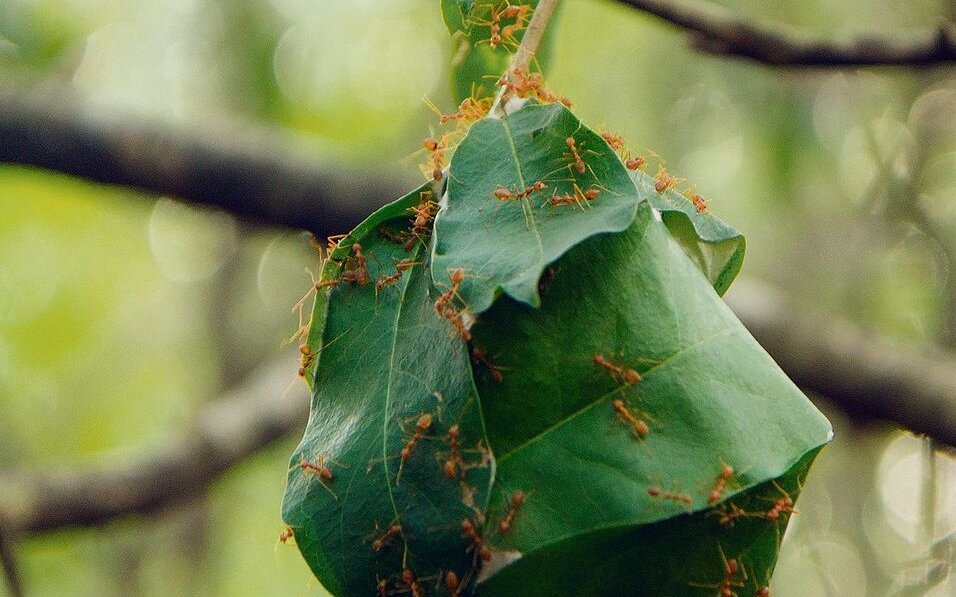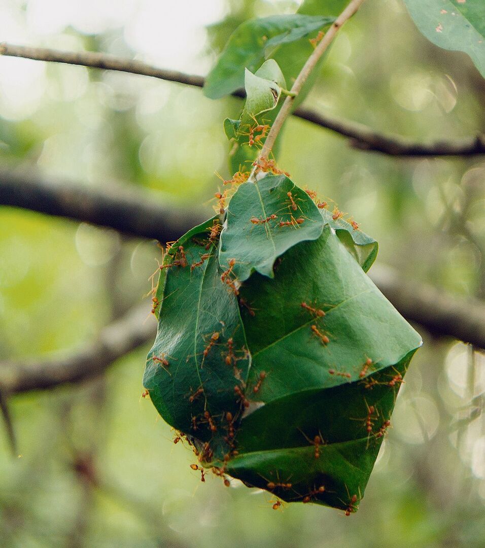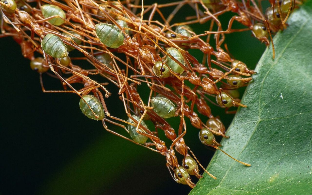 Während Laubenvögel ausgesprochen einzelgängerisch handeln, ist bei anderen Tieren Teamwork gefragt. Asiatische Weberameisen (Oecophylla smaragdina) bauen ihre Nester in luftiger Höhe. Dafür suchen grosse Arbeiterinnen in den Baumkronen nach geeigneten Blättern, die sie zu sich heranziehen. Gelingt dies einer Ameise, wird sie von anderen unterstützt. Die Insekten bilden dabei regelrechte Ketten, um weiter entfernte Blätter zur entstehenden Struktur heranzuziehen und festzuhalten.