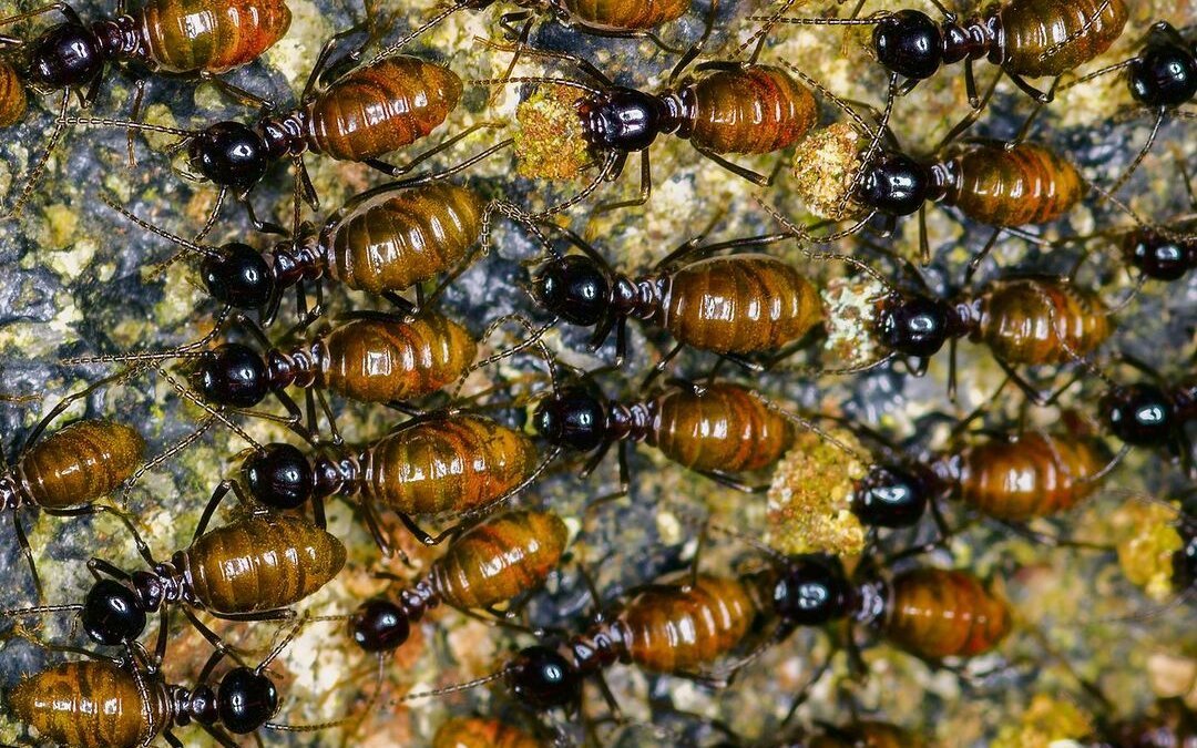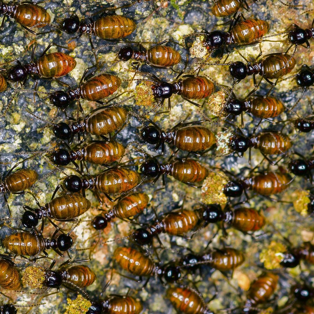 Wenn es um Architekten im Insektenreich geht, dürfen die Termiten nicht unerwähnt bleiben. Obwohl sie nicht näher mit den Ameisen verwandt sind, bilden sie ebenfalls Staaten und bauen erstaunliche Konstruktionen, um diese zu schützen. Ein Termitenstaat besteht normalerweise aus drei verschiedenen Kasten mit unterschiedlichen Aufgaben. Nur die Königin pflanzt sich fort und muss dabei im Unterschied zu einer Ameisenkönigin immer wieder neu von einem «König» begattet werden. Während die Soldaten die Kolonie verteidigen, sind die Arbeiterinnen und Arbeiter mit der Brutpflege, der Nahrungssuche und dem Nestbau beschäftigt.