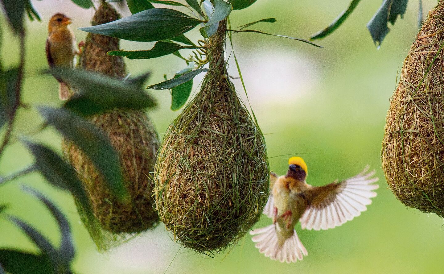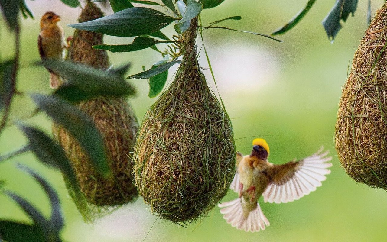 Die beutelähnliche Bauweise von Vogelnestern ist weltweit verbreitet. Bei den Webervögeln wie dem in Indien und Südostasien verbreiteten Bajaweber (Ploceus philippinus) sind es meistens die Männchen, die in elaborierte Bauweisen investieren. Im Gegensatz zu den Beutelmeisen bilden sie Kolonien von über 200 Individuen, in denen die Weibchen die Nester auswählen, in die sie ihre Eier legen wollen. Entsprechend baut ein Männchen bis zu fünf verschiedene Nester gleichzeitig, um die Chance zu erhöhen, dass eins davon den Ansprüchen der Damenwelt genügt. Sind die Jungen erst mal geschlüpft, versorgt das Weibchen sie alleine, bis sie nach rund zwei Wochen das Nest verlassen und sich der Kolonie anschliessen.