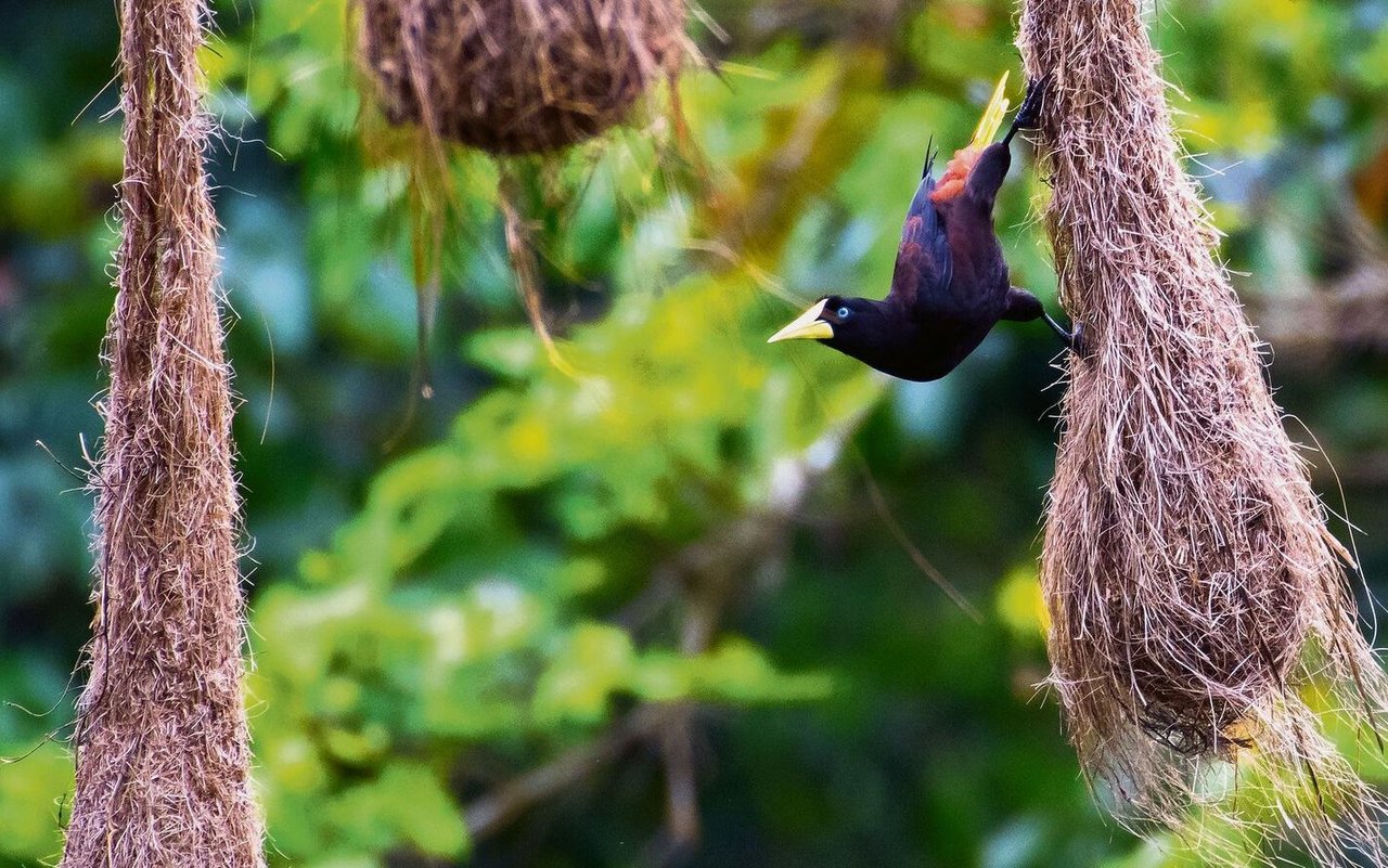 Wesentlich grösser als die spatzenähnlichen Webervögel ist der Oropendula (Psarocolius montezuma), auch Montezumastirnvogel genannt. Die bis zu einem halben Kilogramm schweren Vögel sind in Zentralamerika heimisch und bauen grosse Hängenester. Hier sind es allerdings die Weibchen, die die Arbeit übernehmen, während ein dominantes Männchen die Kolonie verteidigt und während der Paarungszeit aufwendige Balzzeremonien abhält, in denen es sich kopfüber von Ästen baumeln lässt.