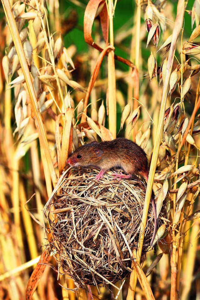 Während der Biber das grösste europäische Nagetier ist, baut oft in unmittelbarer Nähe das kleinste seine Nester. Die Eurasische Zwergmaus (Micromys minutus) wiegt gerade mal fünf bis sieben Gramm und ist so leicht, dass sie sich auch geschickt auf Halmen weit über dem Boden bewegen kann. Dort baut die Maus ihr kugelrundes Sommernest, in dem sie ihre Jungen zur Welt bringt und aufzieht.