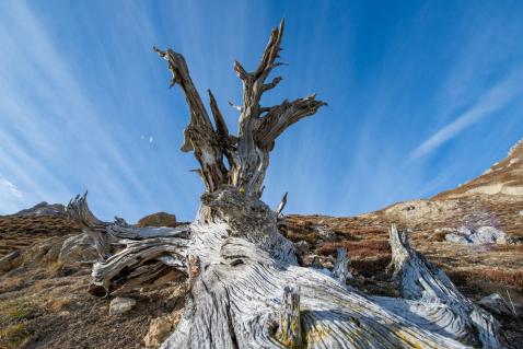 Vorbei gehts an scheinbar toten Föhren, Lärchen und Arven. Letztere etwa haben gegen 1000 Jahre gelebt und selbst jetzt, im Todeskampf, wollen sie nicht umfallen. Weitere 100 Jahre strecken sie ihre kahlen Äste wie hilfesuchende Arme in den Himmel und wirken wie Gespenster.